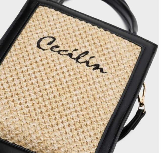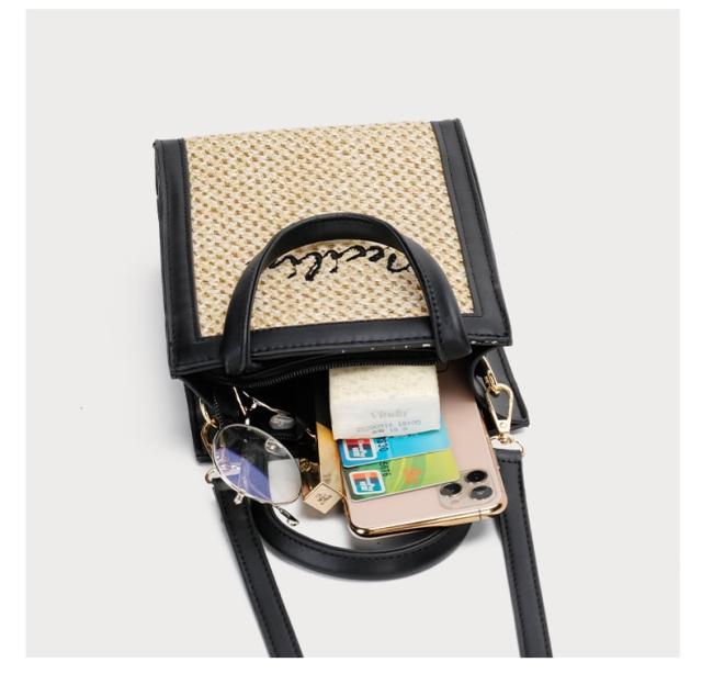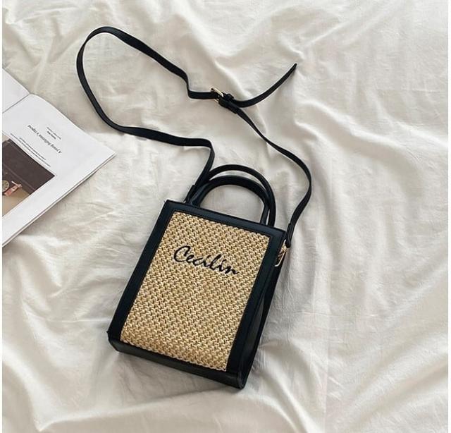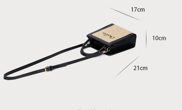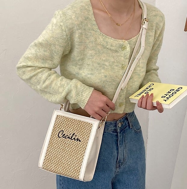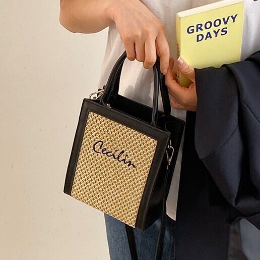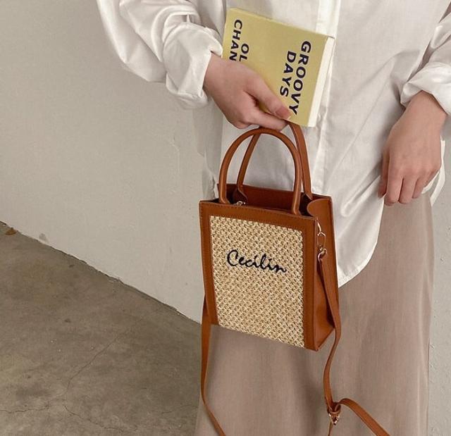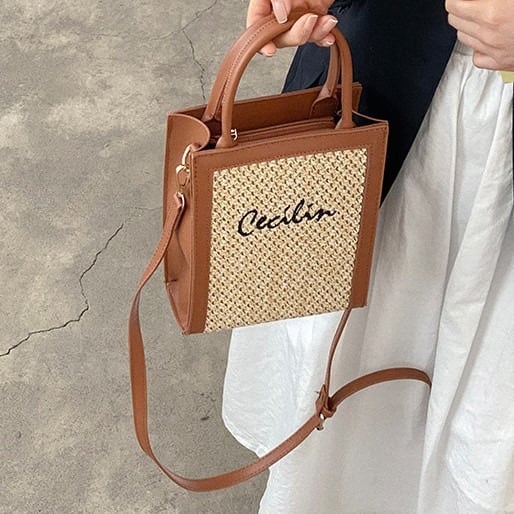 PUレザーとストローの組み合わさったスクエアショルダーバッグ。