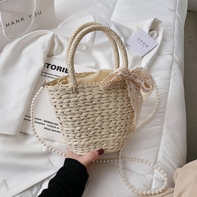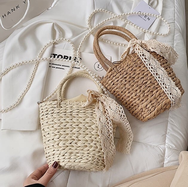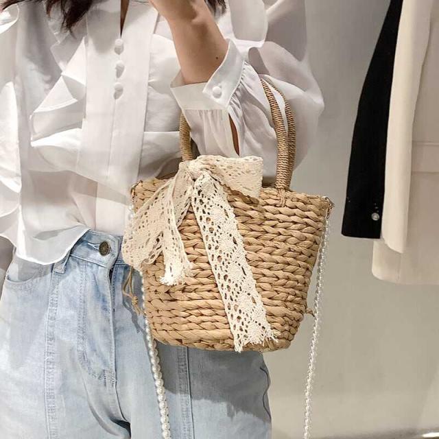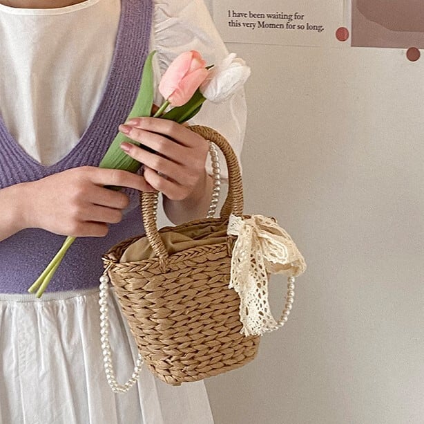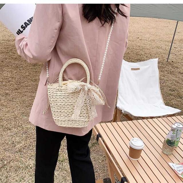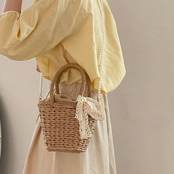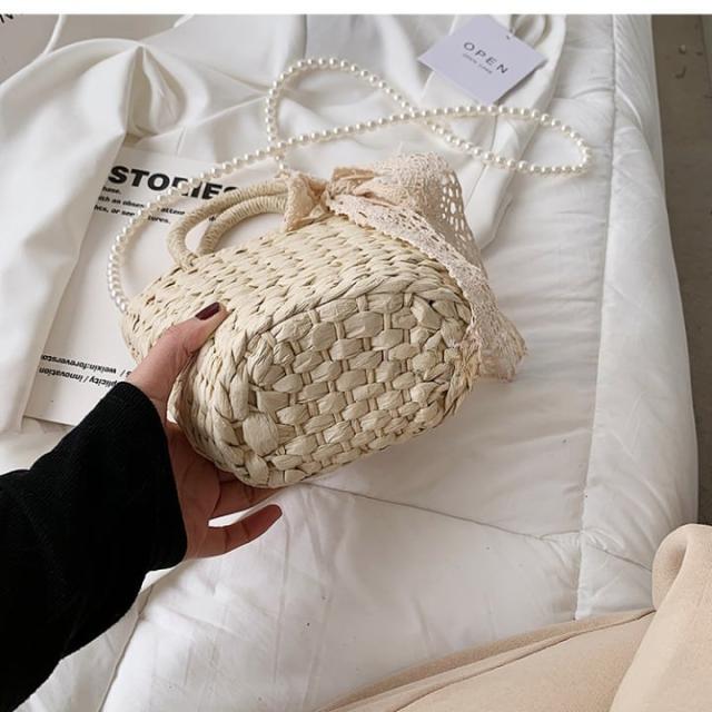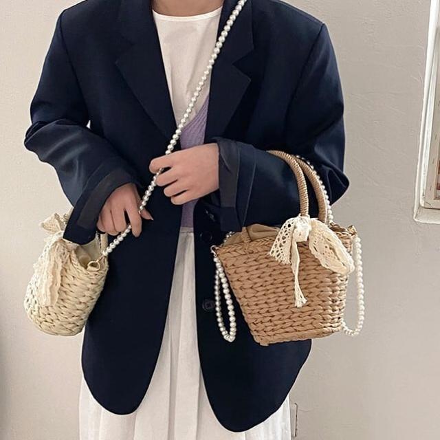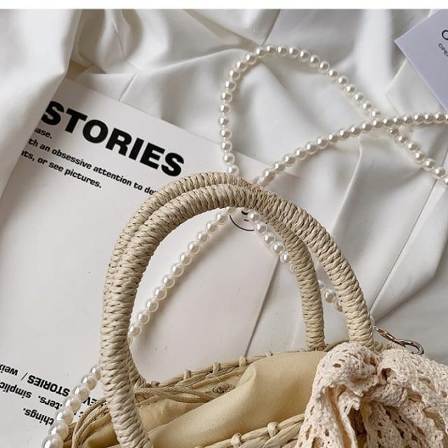 パールのショルダーストラップとレースディテールがフェミニンな印象になるミニストローバッグ