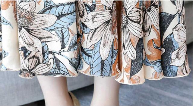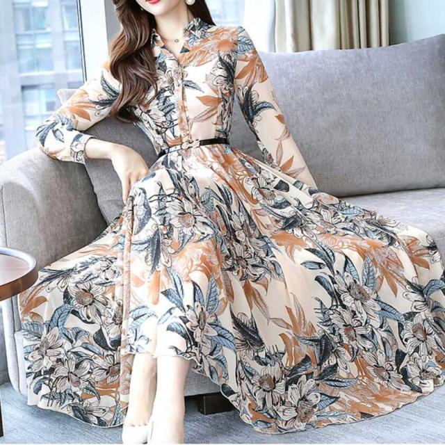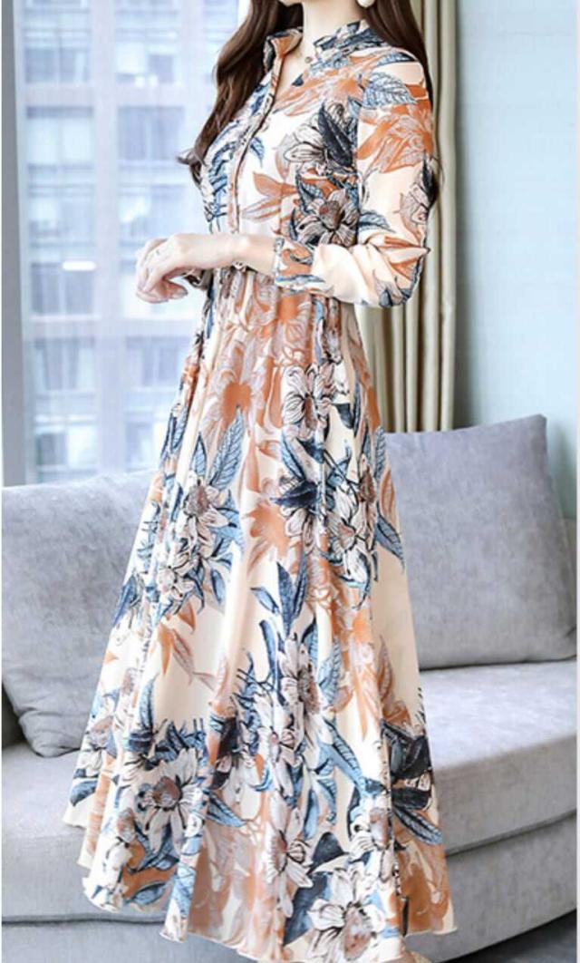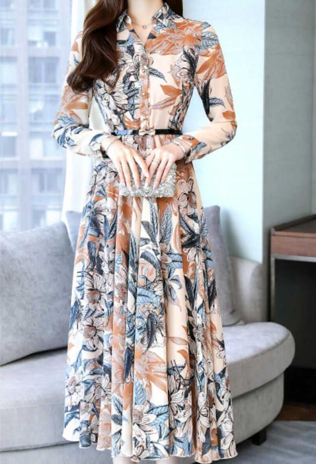 エレガントなプリントのロングフォーマルシャツワンピース。