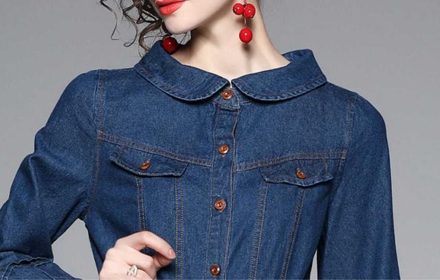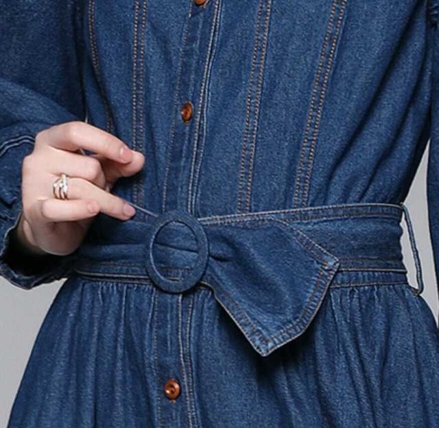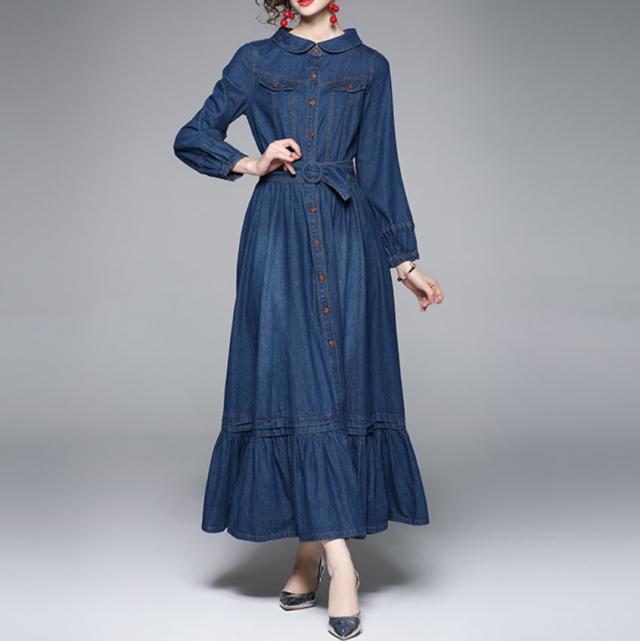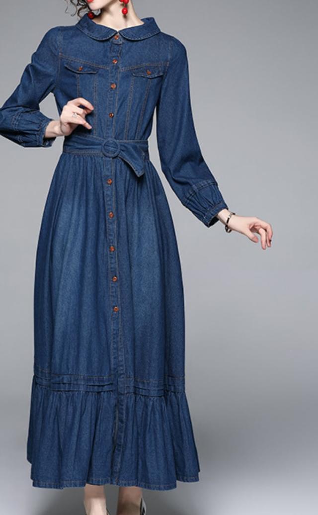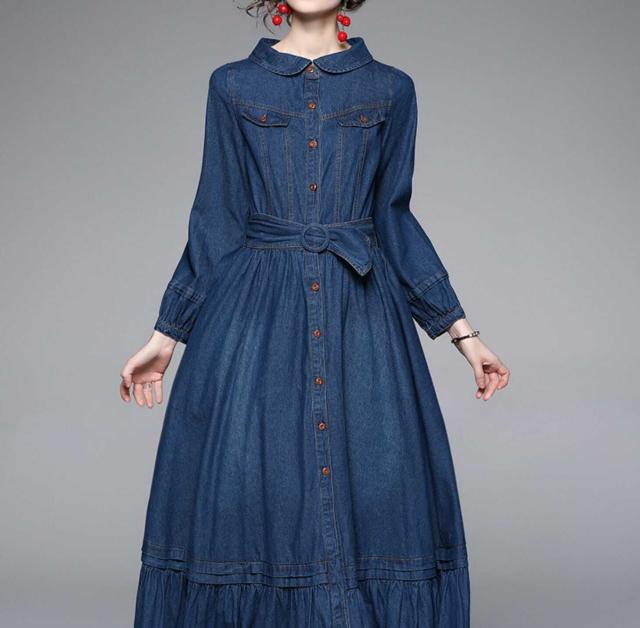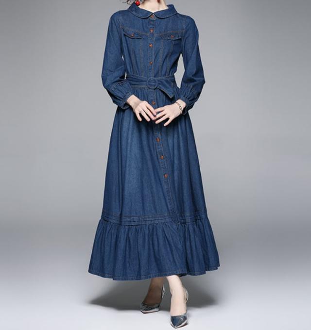 ワンピース 上着 人気 おすすめ おしゃれ お洒落 激安 安い 送料無料 プチプラ 長袖 ロング ラウンドネック 丸首 フレア ふんわり 無地 フリル リボン デニム 可愛い かわいい 韓国 シンプル