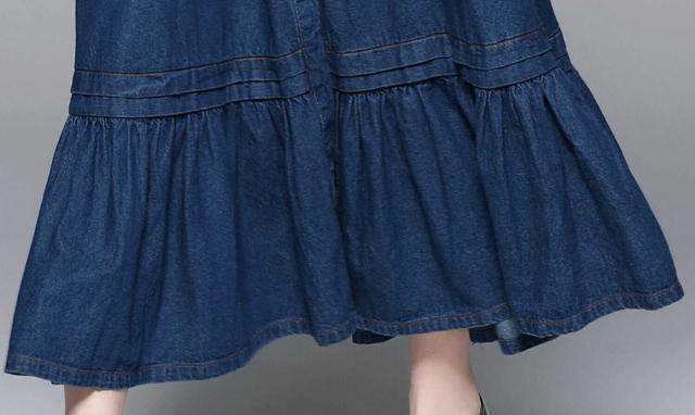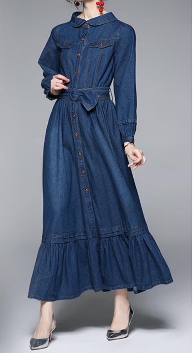 デニム生地のマキシフレアワンピース。
