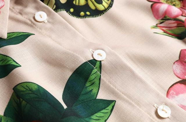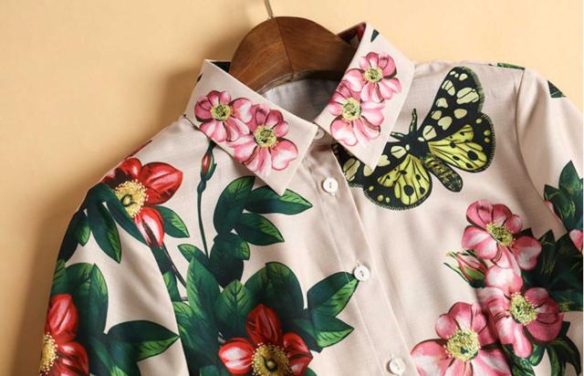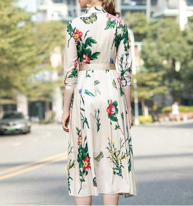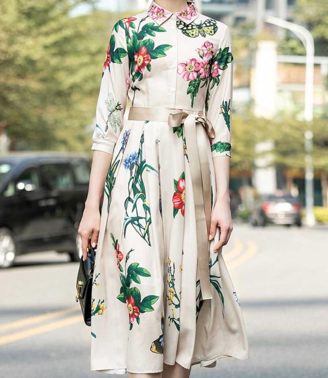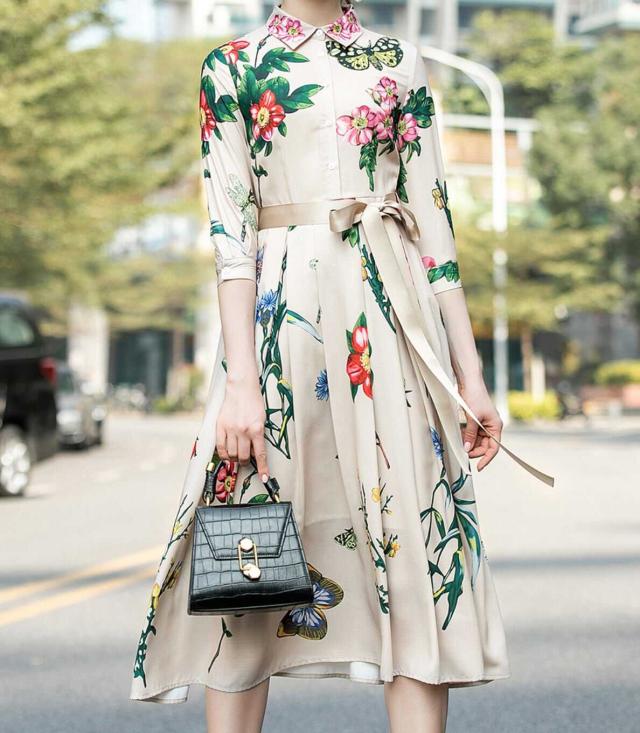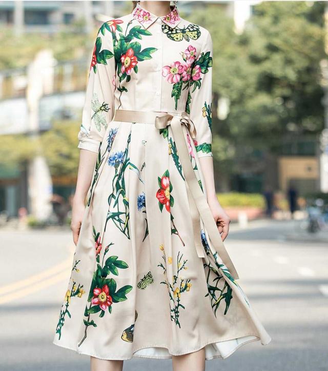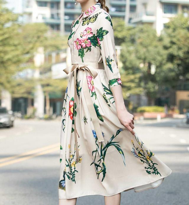 シックなフローラルプリントのロングシャツワンピース。
