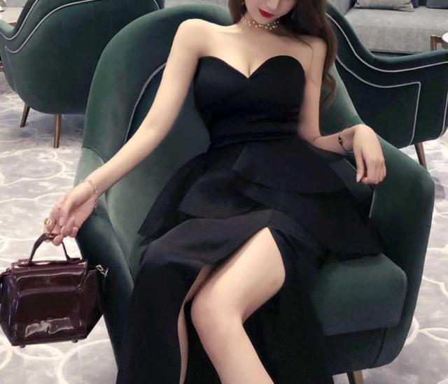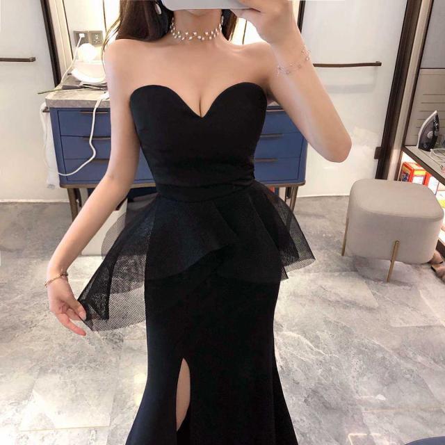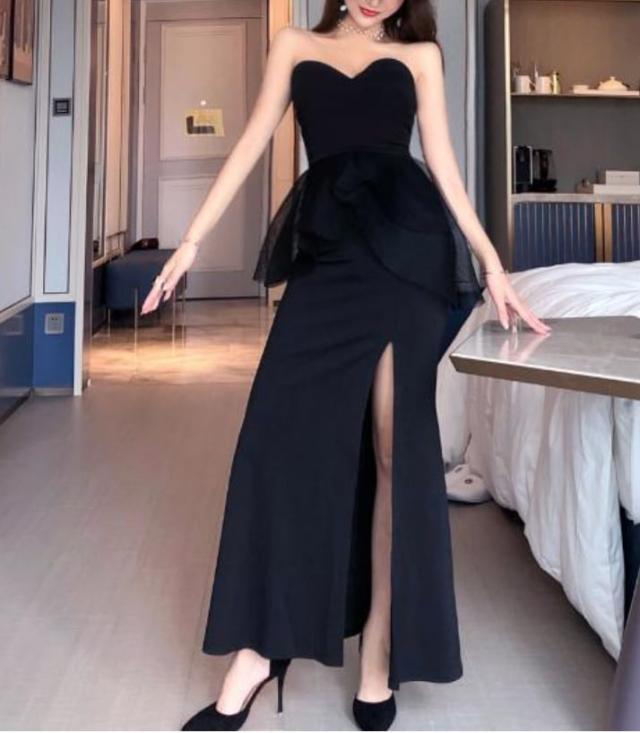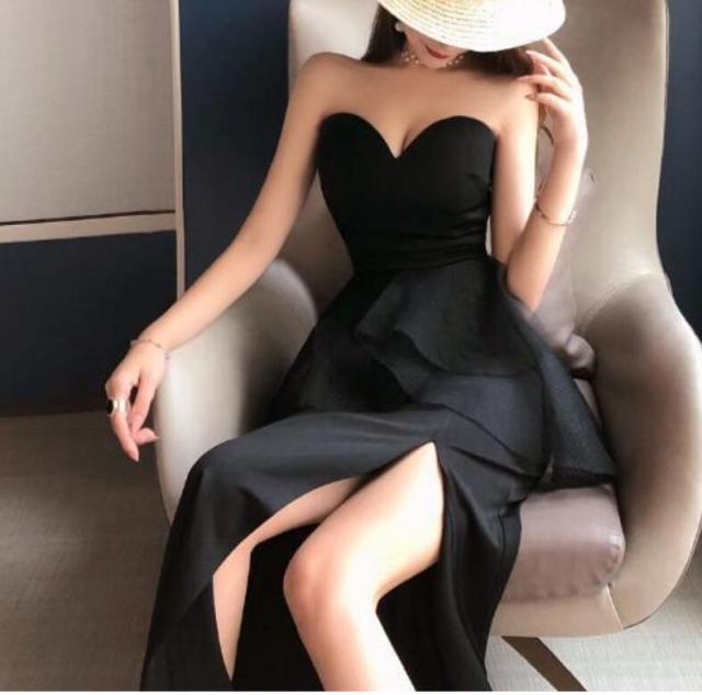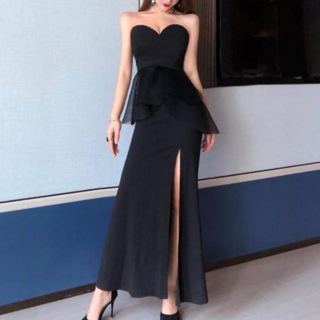 セクシーなベアトップのロングスリットフォーマルドレス。
