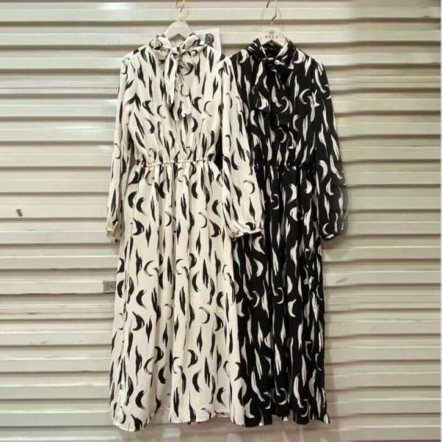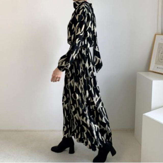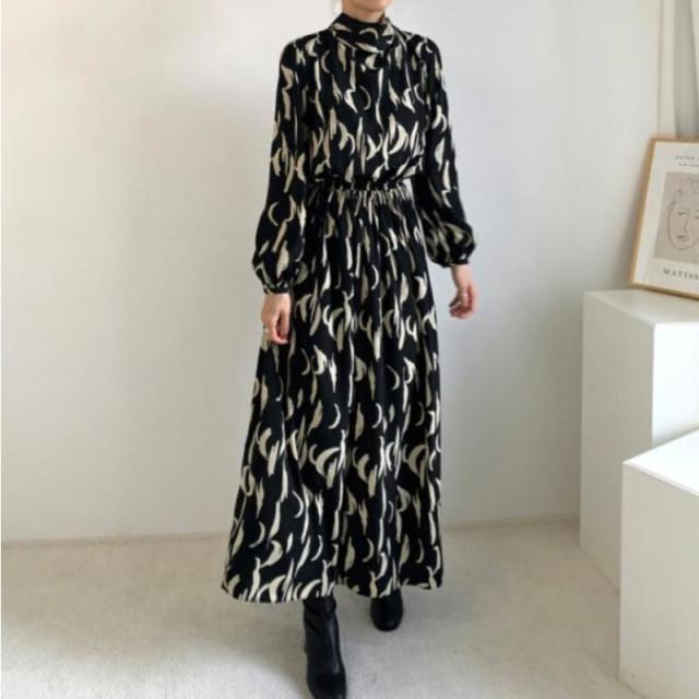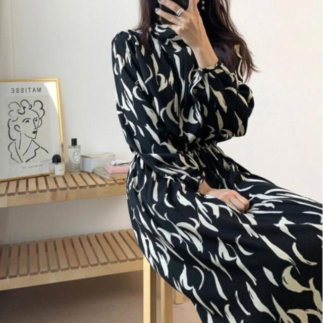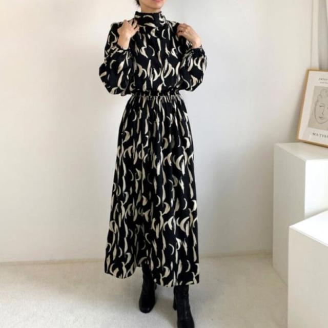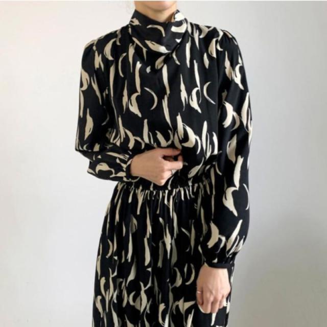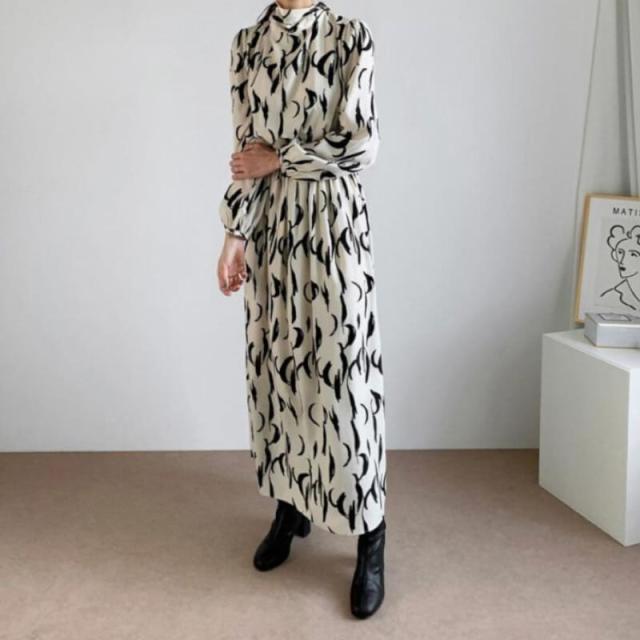 ワンピース 膝下 ロング丈 袖あり 長袖 パフスリーブ リボンネック シフォン きれいめ シンプル カジュアル 上品 おしゃれ レトロ 個性的 クール エレガント グラフィック 春 秋 10代 20代