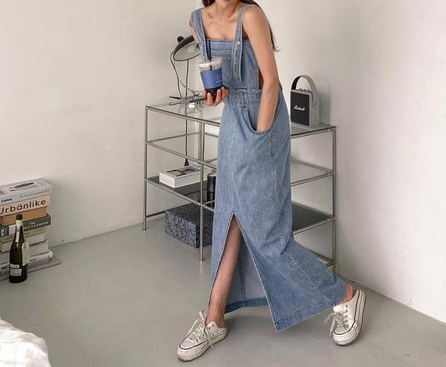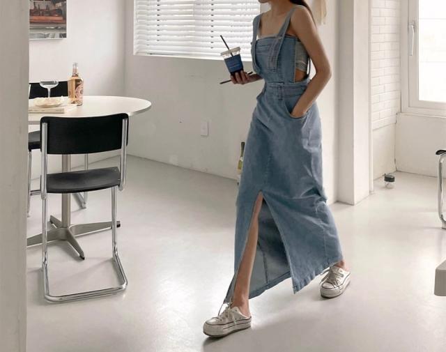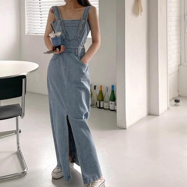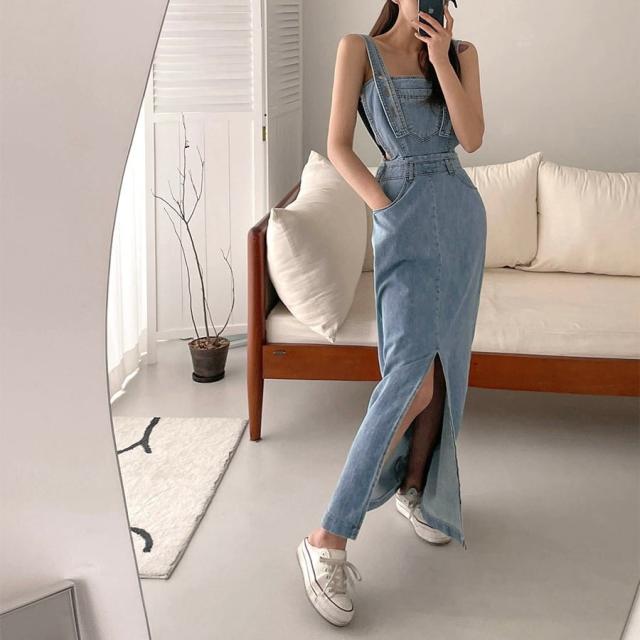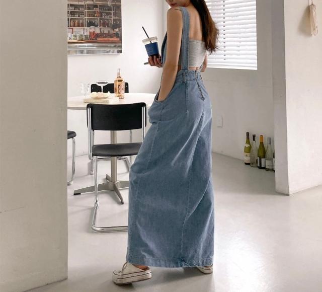 ワンピース スカート サスペンダー デニム ブルー 青 袖なし フロントスリット バックジップ ロング丈 ワントーン ワンカラー 大人女子 カジュアル セクシー HIPHOP スポーティー お洒落