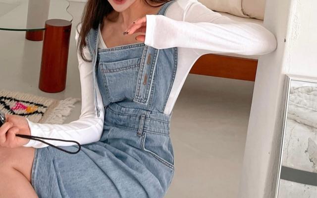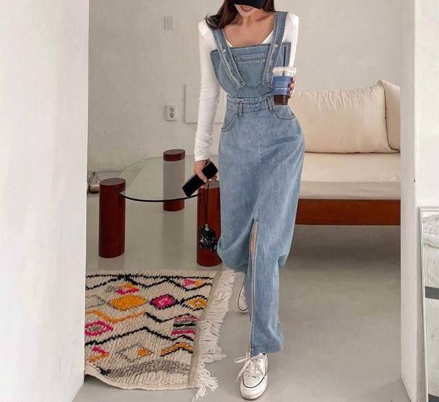 深めのフロントスリットがセクシーな存在感抜群なサスペンダー付きデニムスカート。
