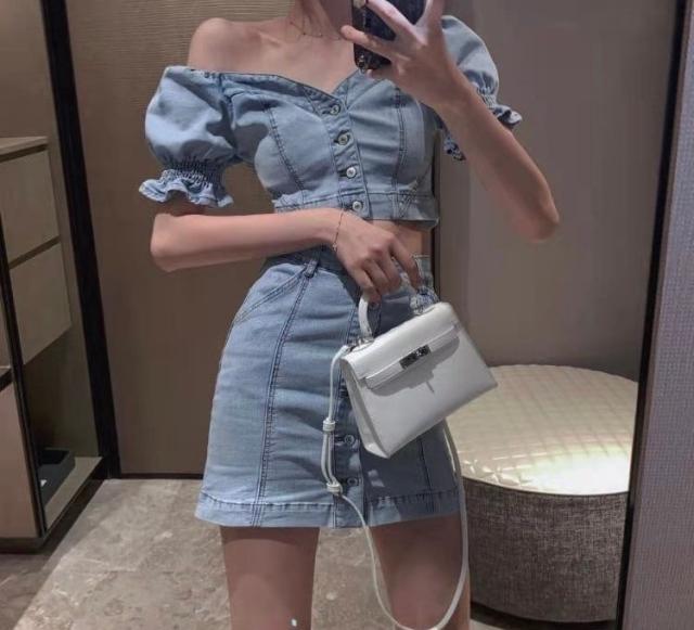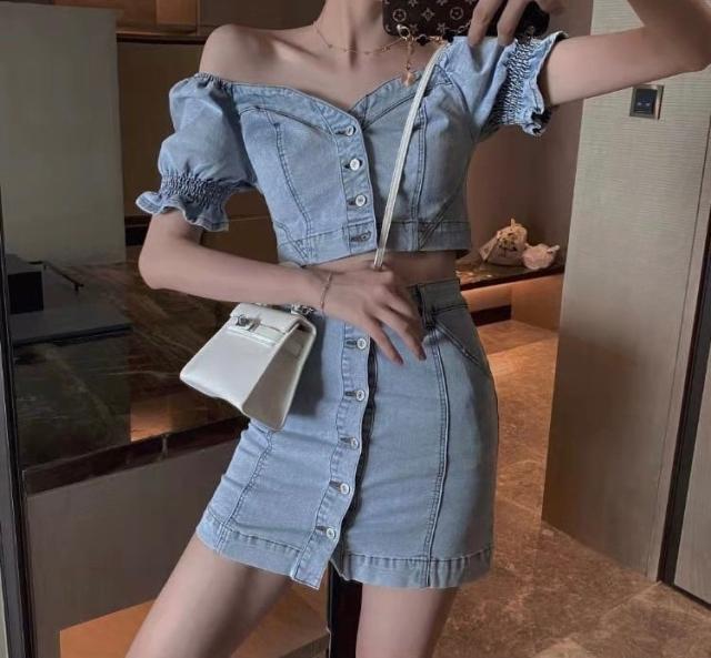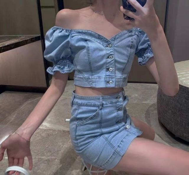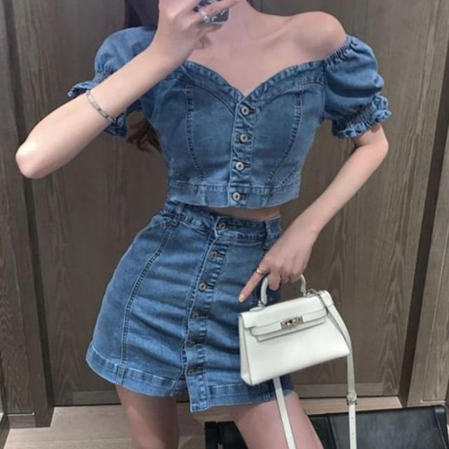 セットアップ 2点セット ツーピース ハイウエスト 脚長効果 デニム ミニ丈 ショート丈 トップス スカート 半袖 フリル 袖あり Vネック オフショルダー 肩見せ スリム 細身 パフスリーブ