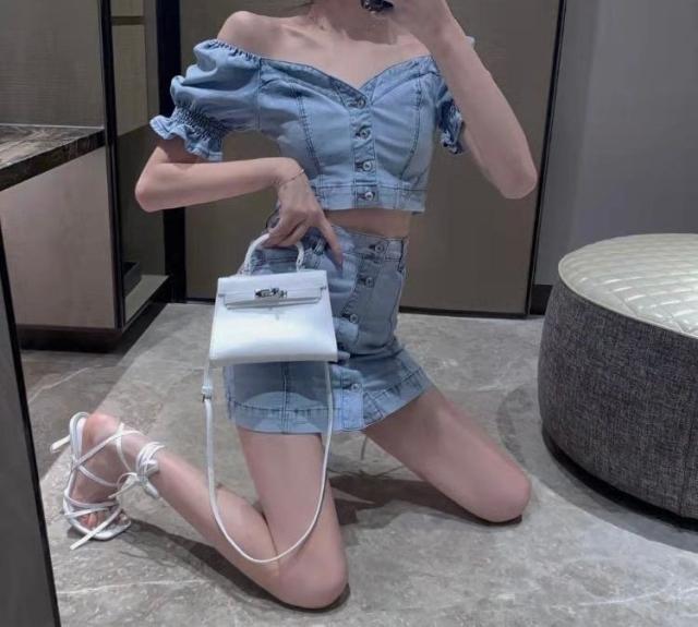 ショート丈トップスとミニ丈ボトムスがセクシーなデニムセットアップ。