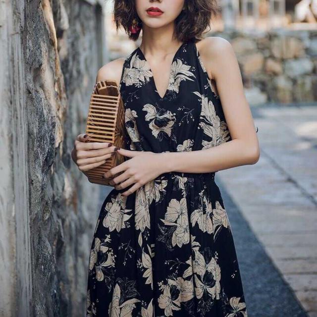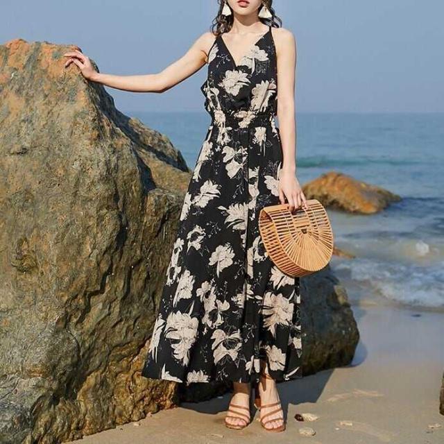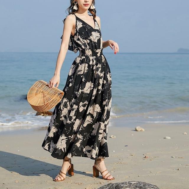 大きめのエキゾチックなデザインのフラワー柄がおしゃれなリゾートワンピースです。
