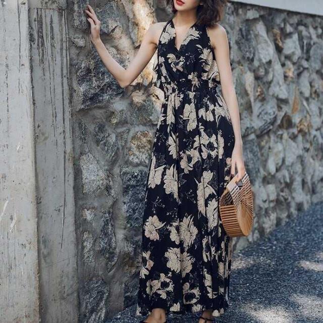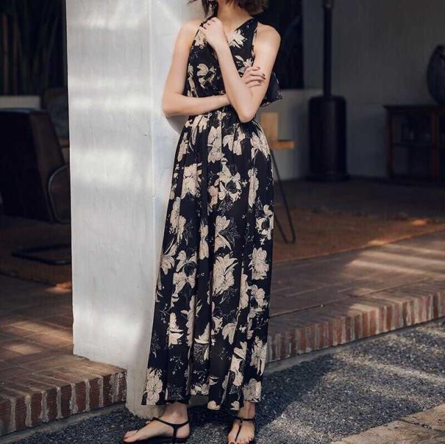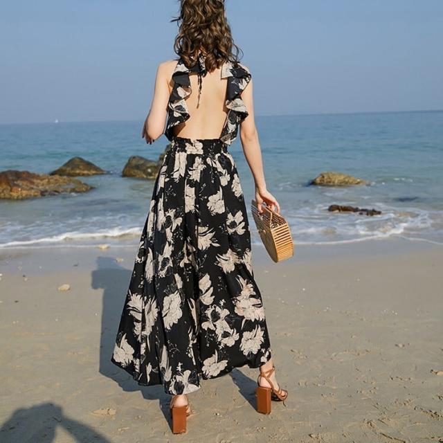 エキゾチック ワンピース バックレス オープンバック フレア ハイウエスト Vネック モノトーン ブラック フリル 花柄 フラワーノースリーブ ロング丈 マキシ丈 フローラルかわいい