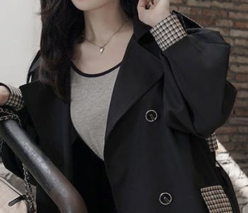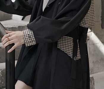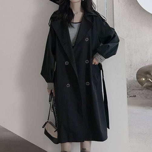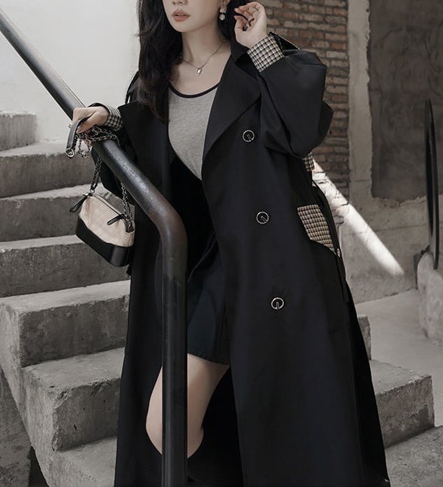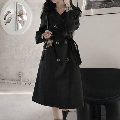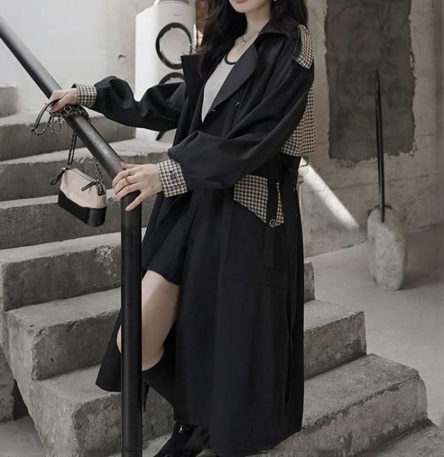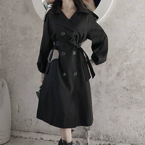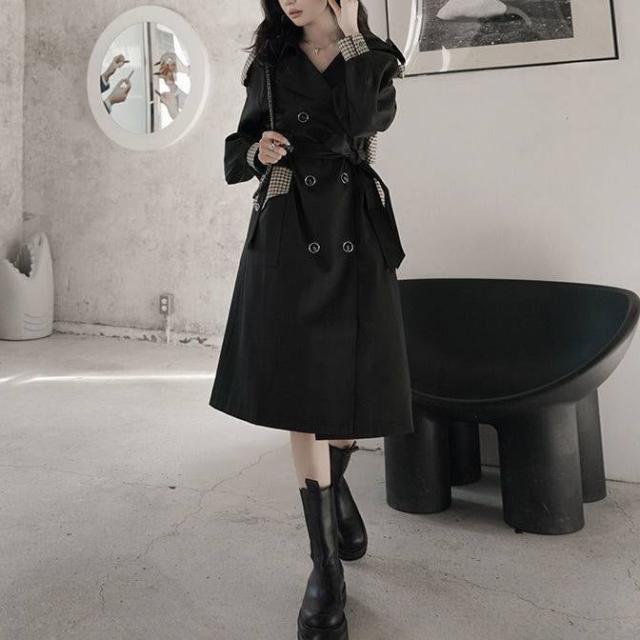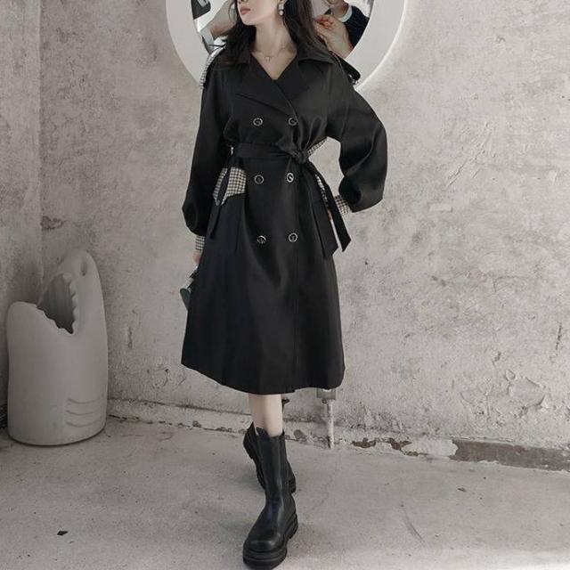 アウター 上着 コート トレンチコート Aライン 膝下丈 ロング丈 ボリューム袖 チェック 格子柄 無地 襟付き ダブルブレスト バックシャン バックコンシャス 体型カバー スタイルアップ