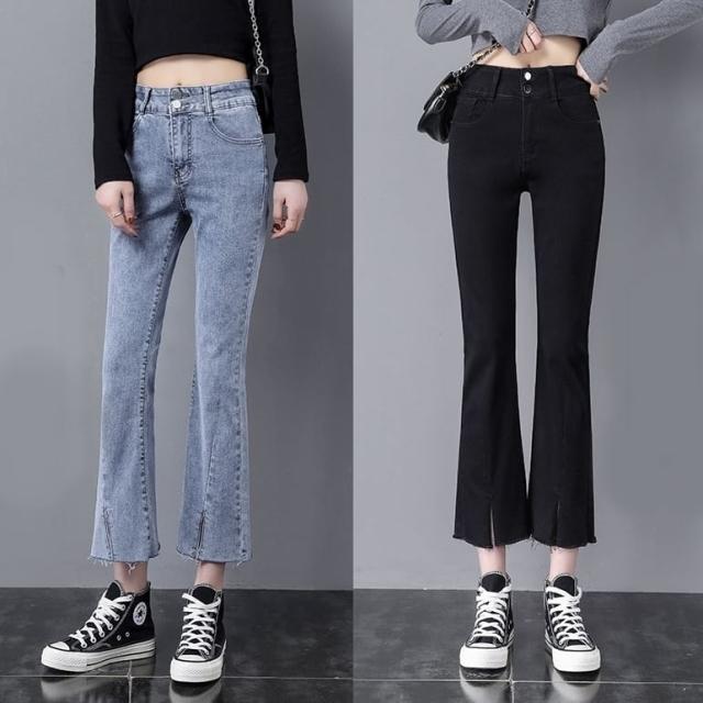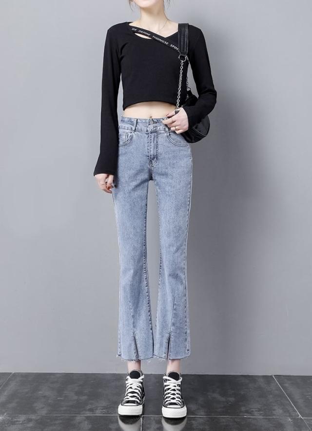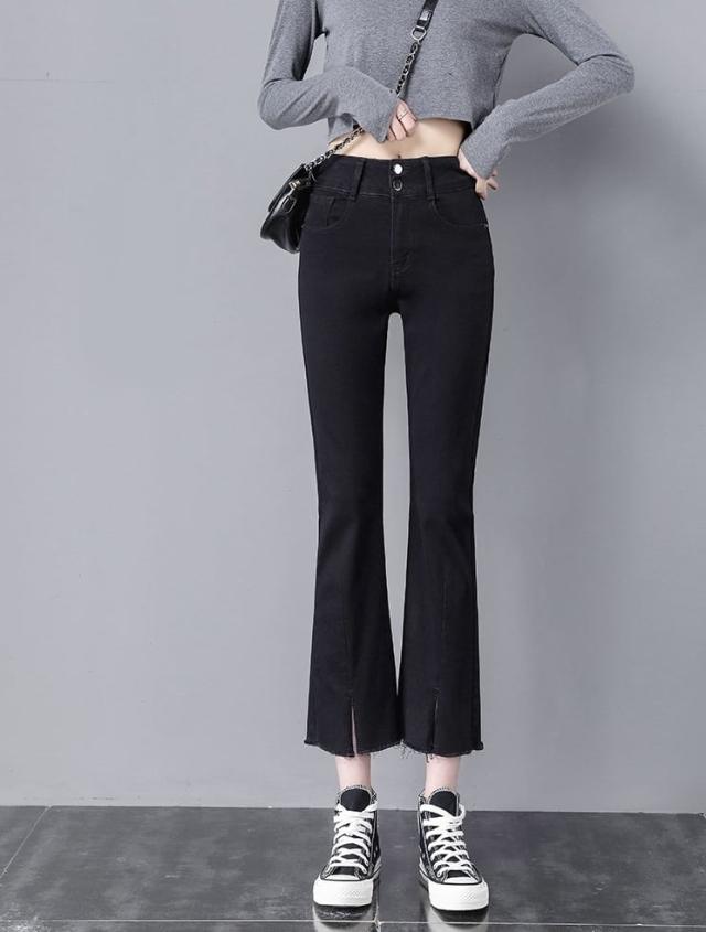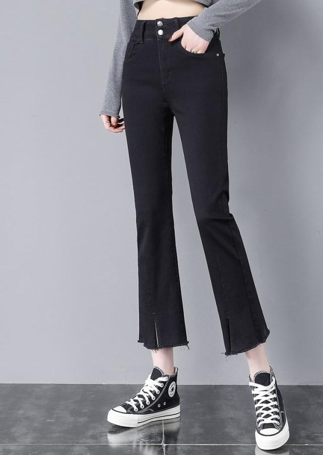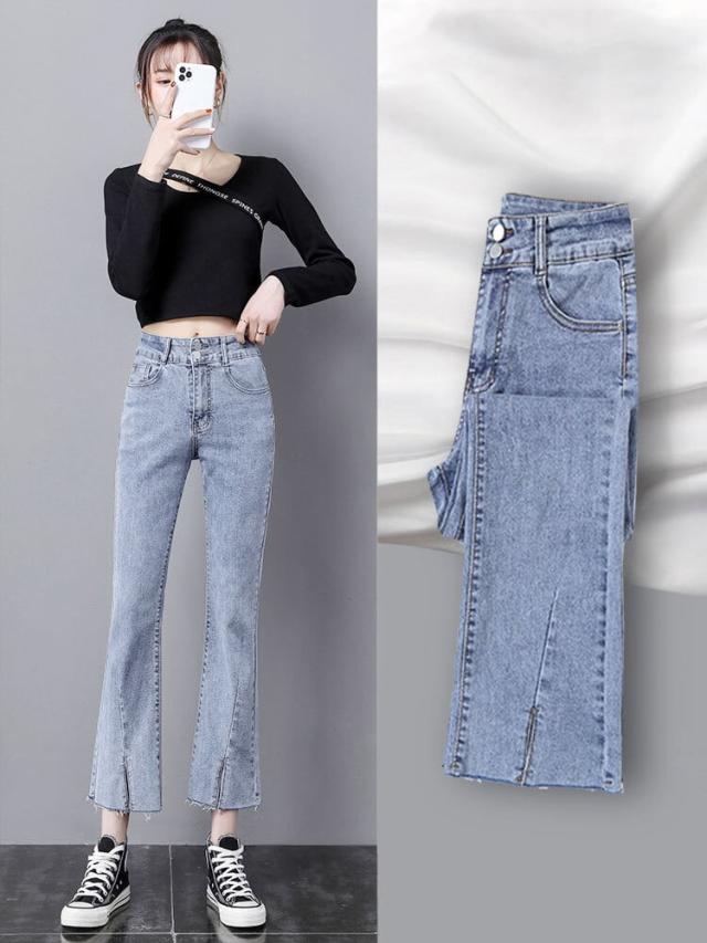 ダメージ ジーンズ 長ズボン フレア ジーパン スリット カットオフ セミフレア パンツ ハイウエスト ストレッチ ミモレ 丈 スキニー スリット ストレッチ 美脚 動きやすい 韓国 かわいい