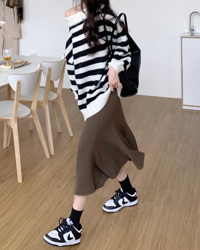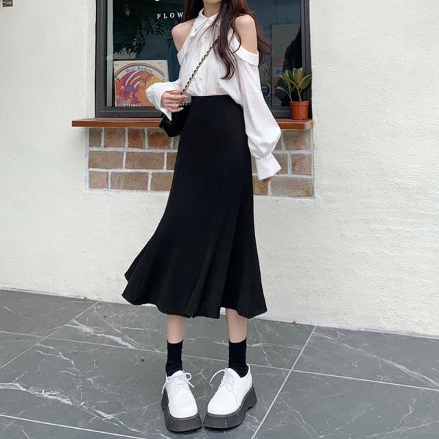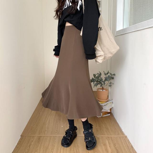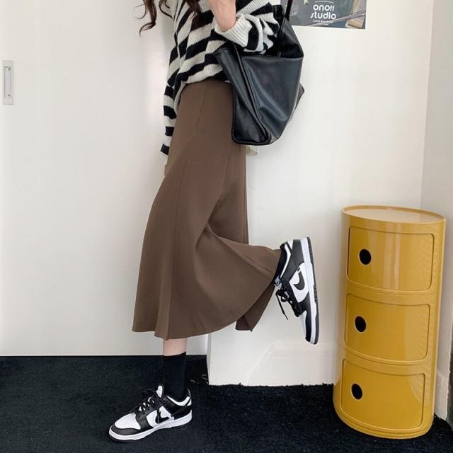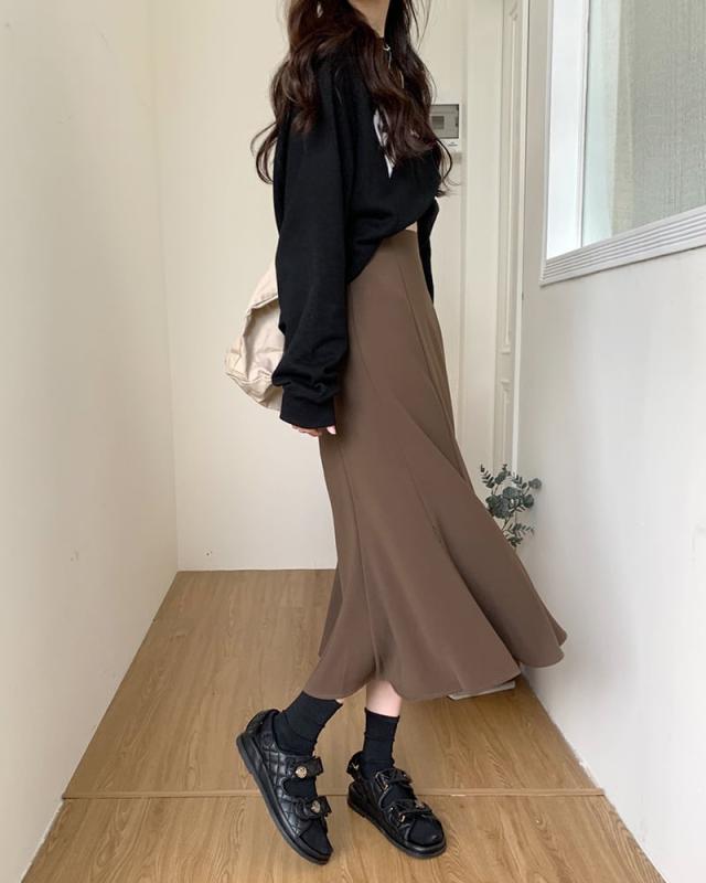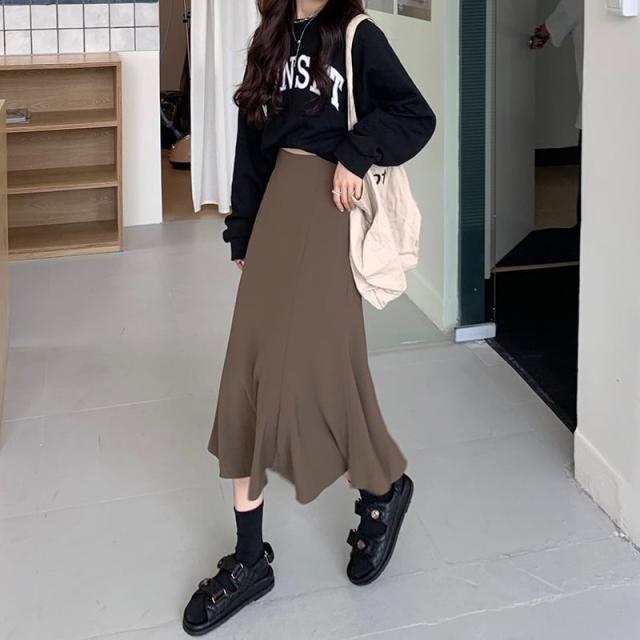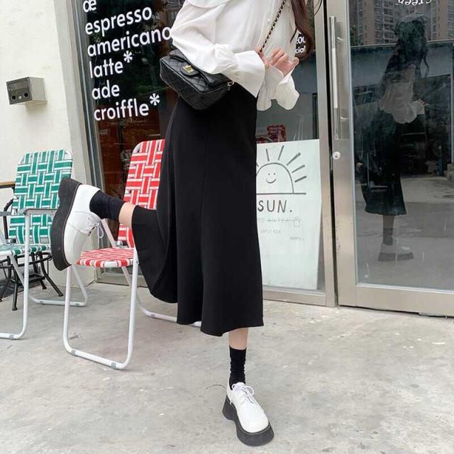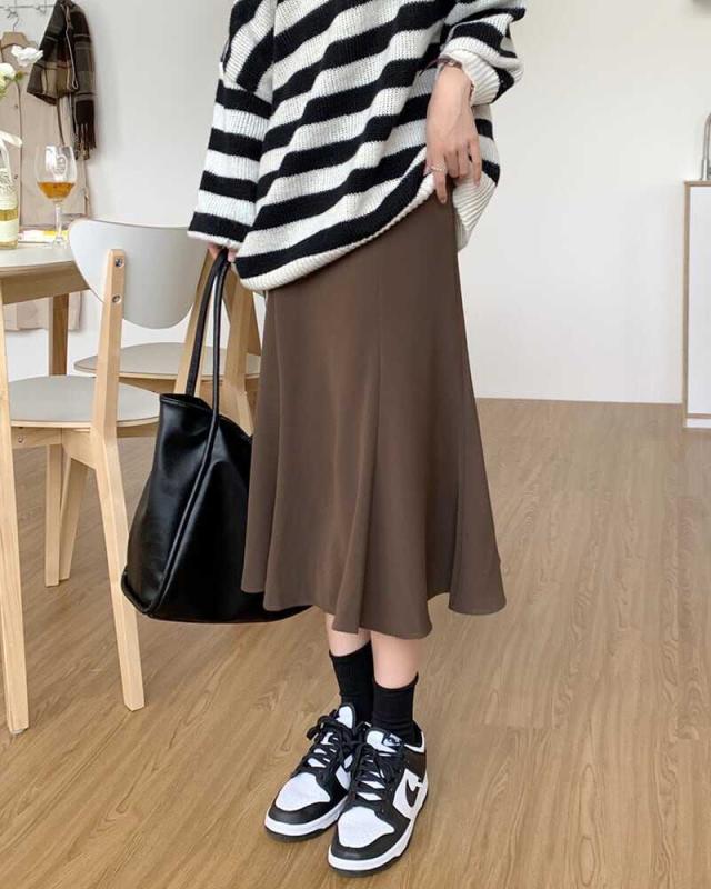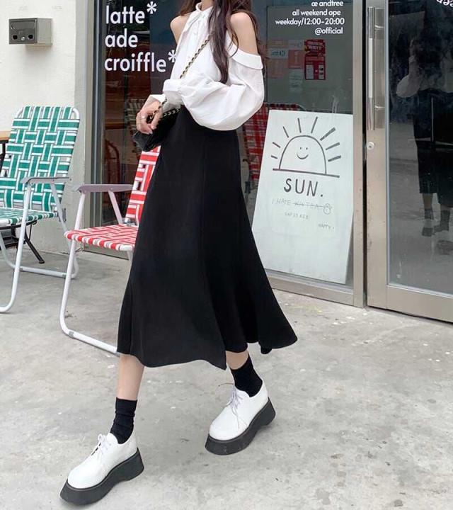 スカート ボトムス ミモレ丈 フレア マーメイドスカート 薄手 ウエストゴム ボリューム モード ハイウエスト ワイド ゆったり ストレッチ 韓国 かわいい 可愛い リラックス きれいめ