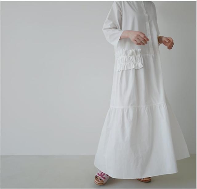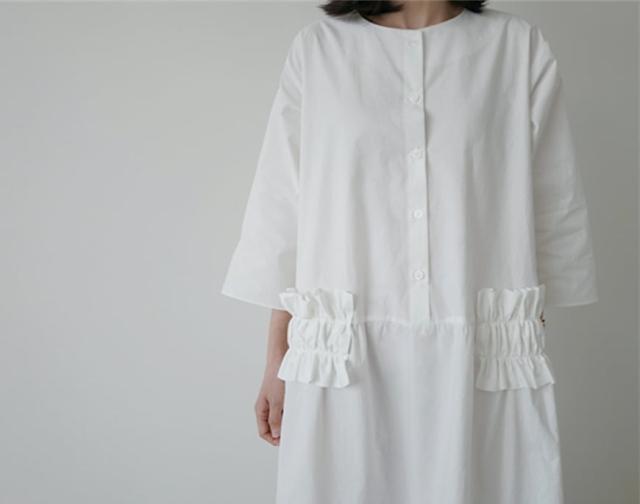 ポケットのフリルがポイントのオーバーサイズシャツワンピース。