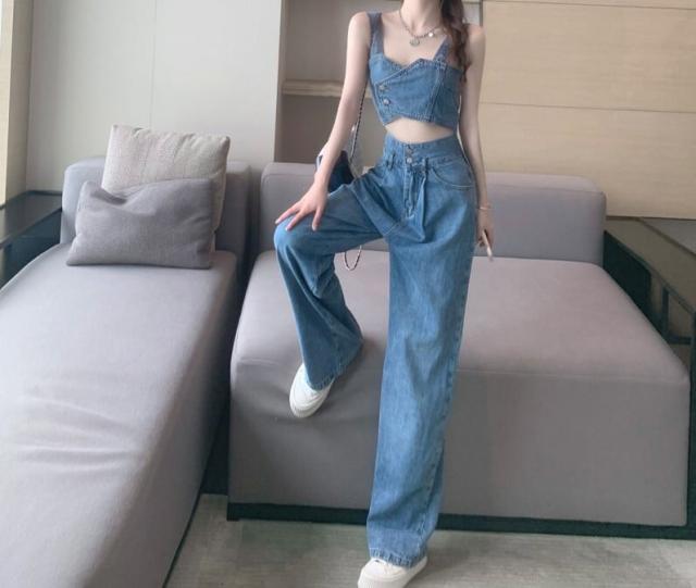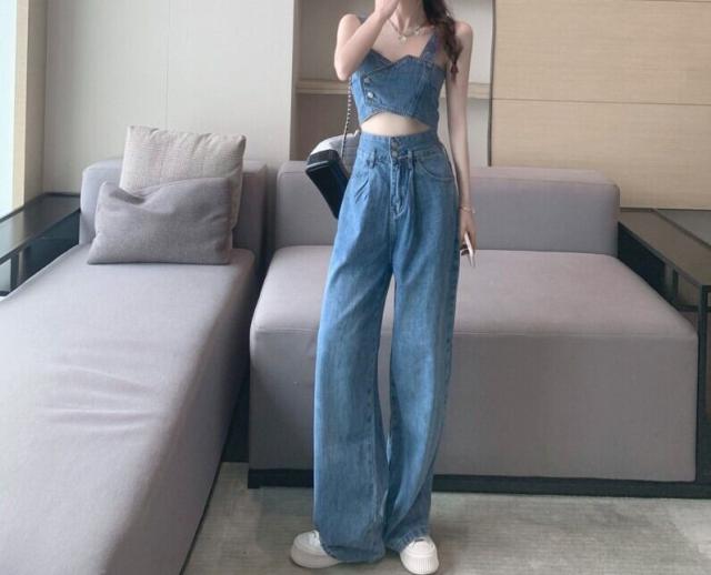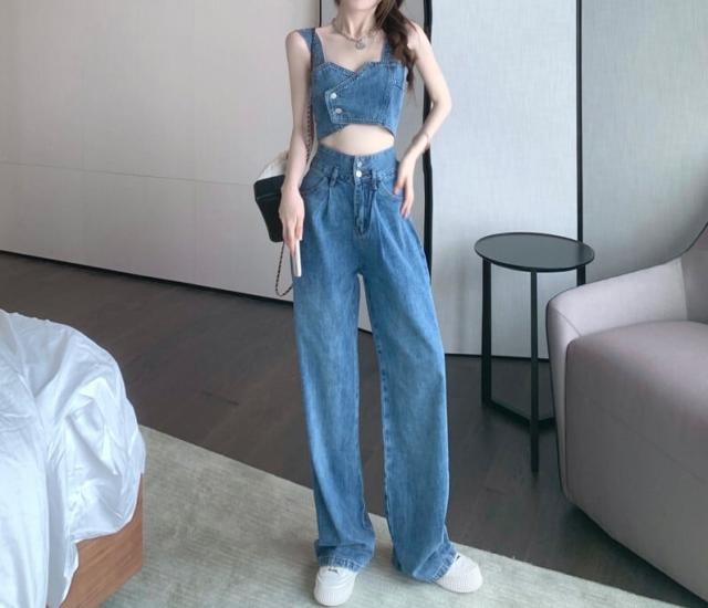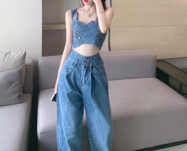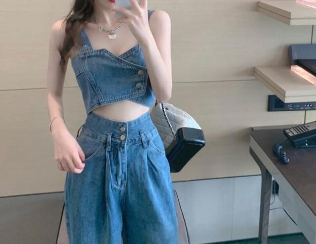 デニムベストビスチェ&ハイウエストブルーデニム セクシー 肩出し ノースリーブ 無地 デニム ポリエステル クールビズ 着痩せ 体型カバー 可愛い かわいい 韓国 シンプル カジュアル