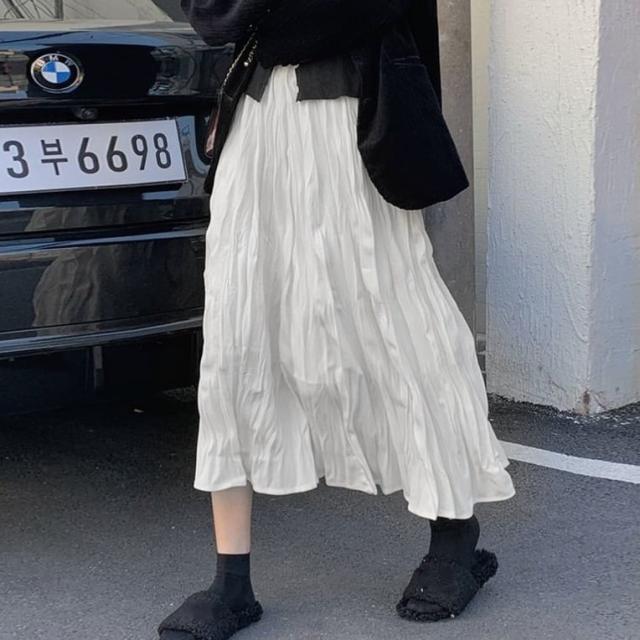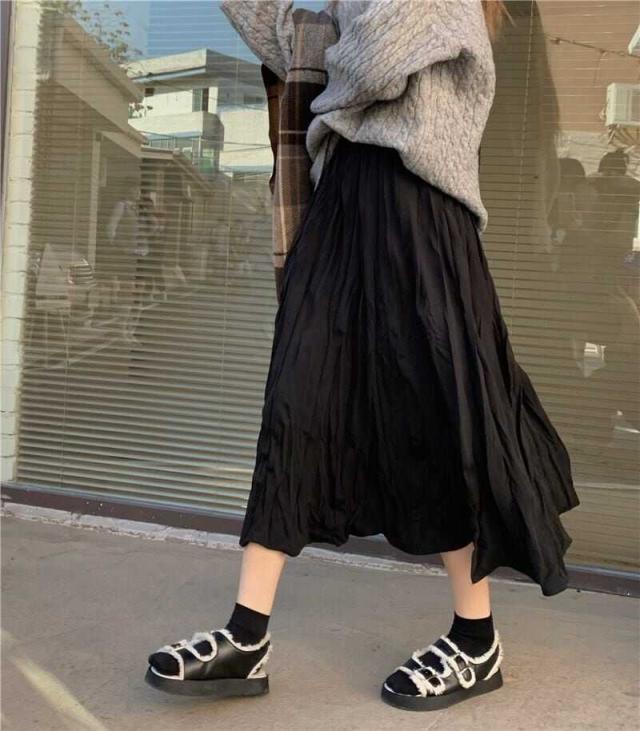 スカート ボトムス ミモレ丈 フレア プリーツ 無地 しわ加工 モノトーン クリンクルプリーツ ニュアンスカラー バイカラー ウエストゴム ボリューム モード ハイウエスト ワイド ゆったり