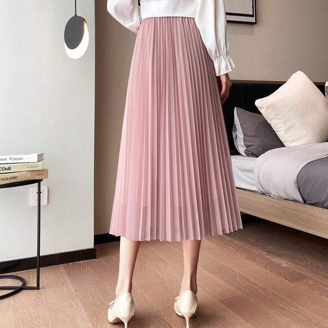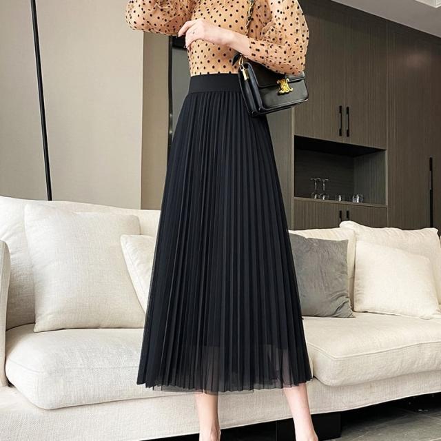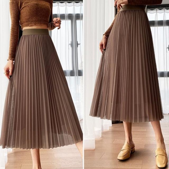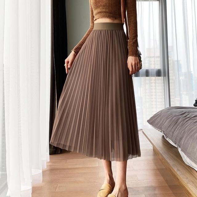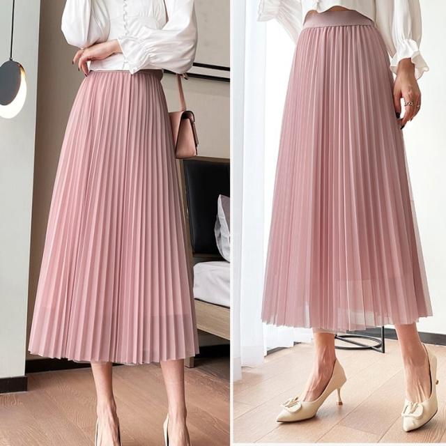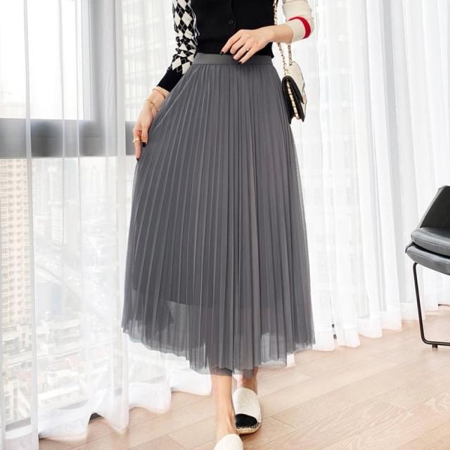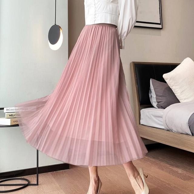 スカート ボトムス ミディアム丈 ひざ丈 チュール ボリューム フレア プリーツ ギャザー ウエストゴム ボリューム モード ハイウエスト ワイド ゆったり ストレッチ 韓国 かわいい 可愛い