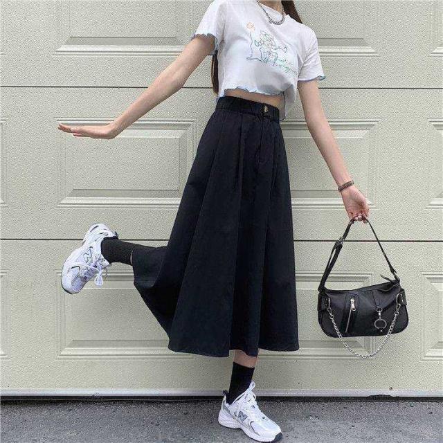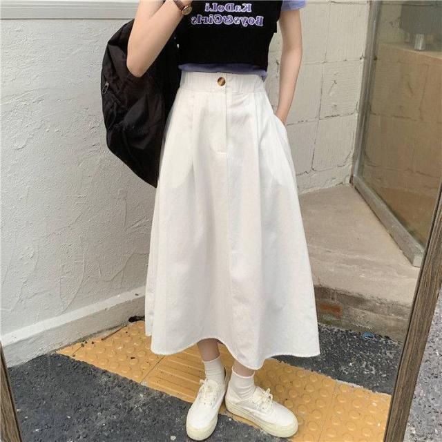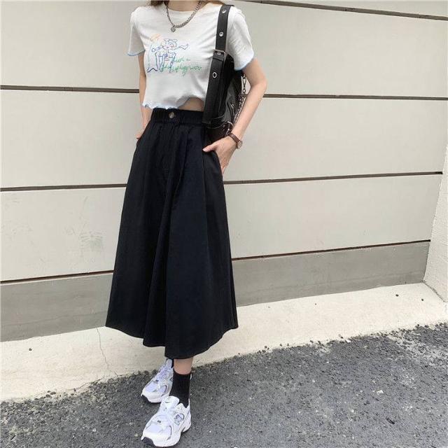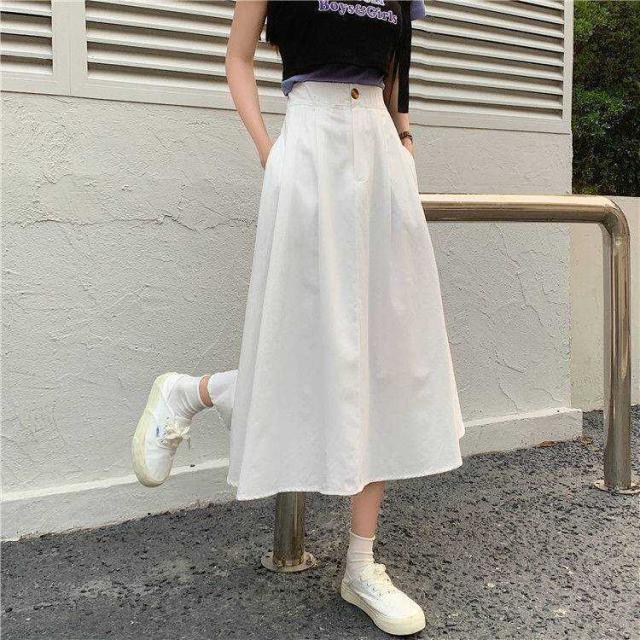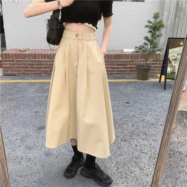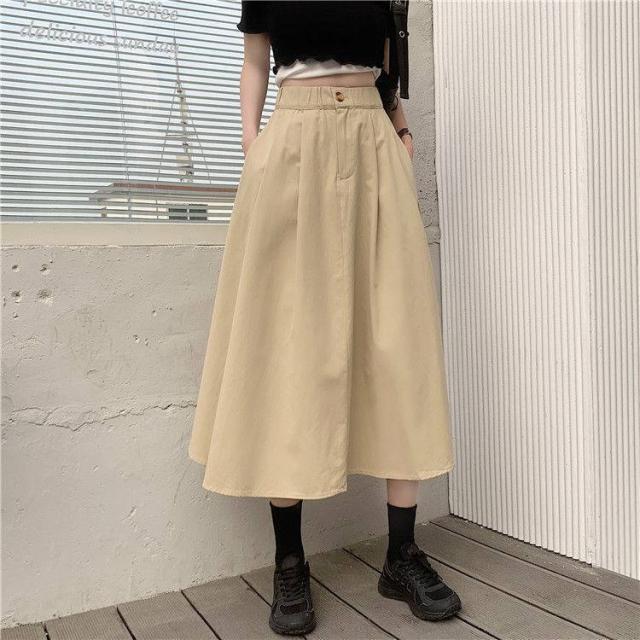 スカート ボトムス ミモレ丈 フレア プリーツ 無地 べっ甲ボタン ニュアンスカラー ミリタリー カーゴ モノトーン バイカラー ウエストゴム ボリューム モード ハイウエスト ワイド