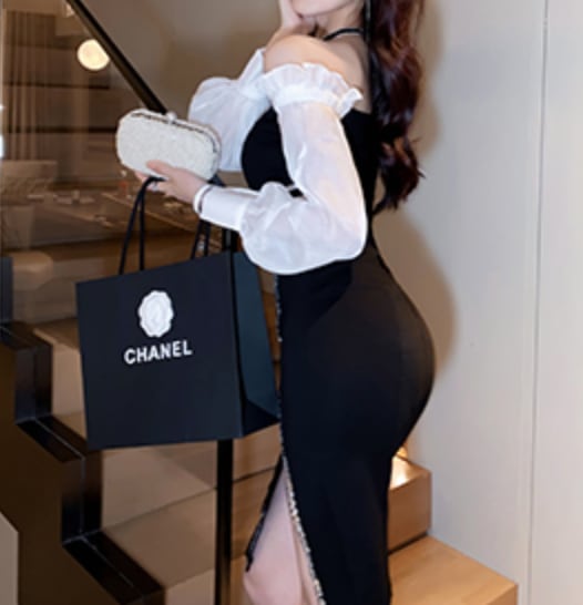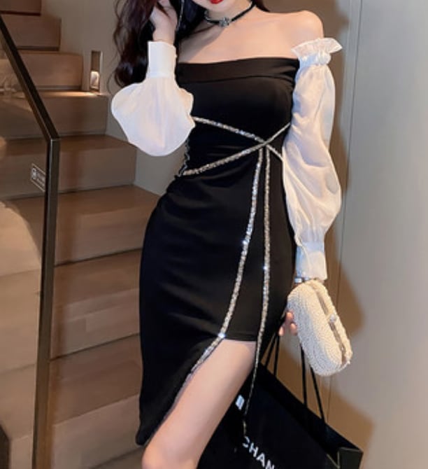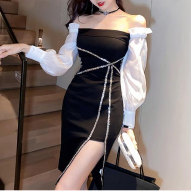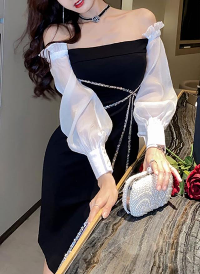 セクシーなシルエットの切り替えオフショルダーパーティードレス。