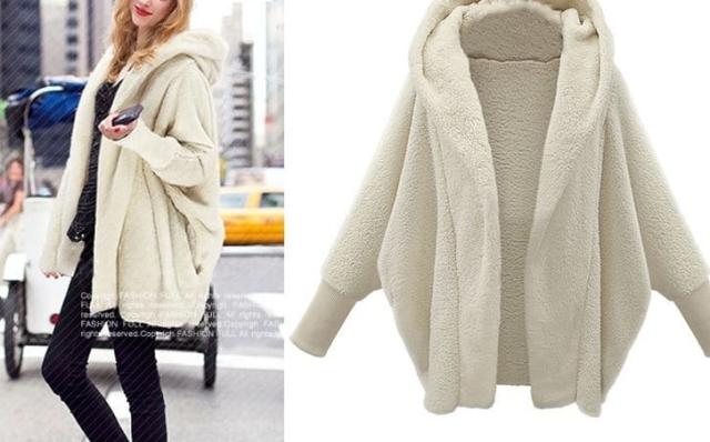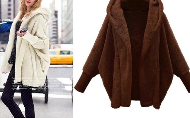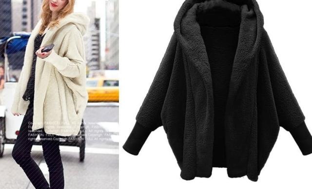 ゆったりオーバーシルエットとフード付きで暖かい一着。