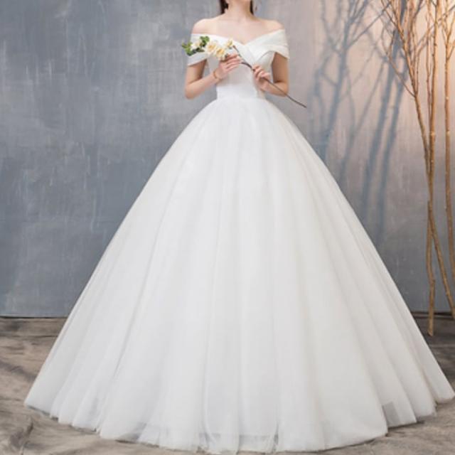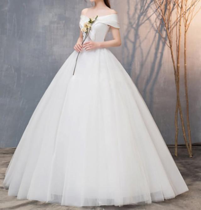 すっきりとしたピュアなシルエットと高級感のあるオフショルダーが綺麗な一枚。