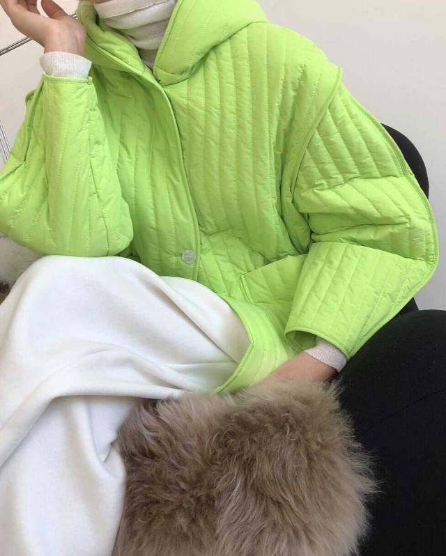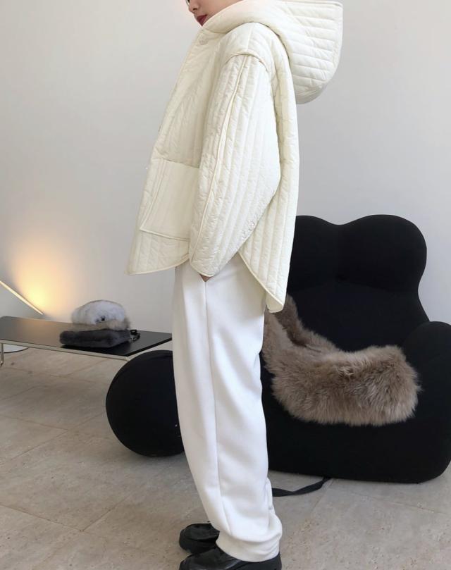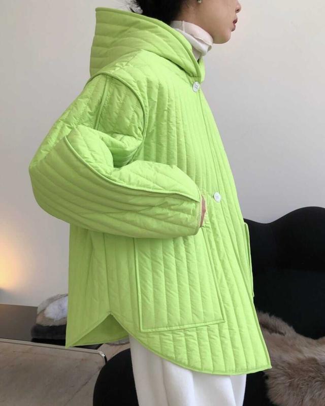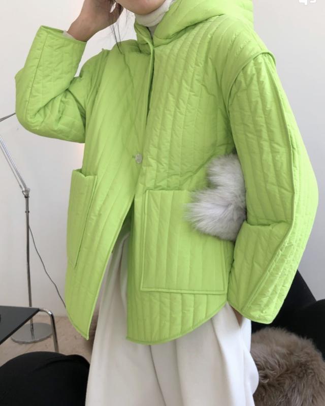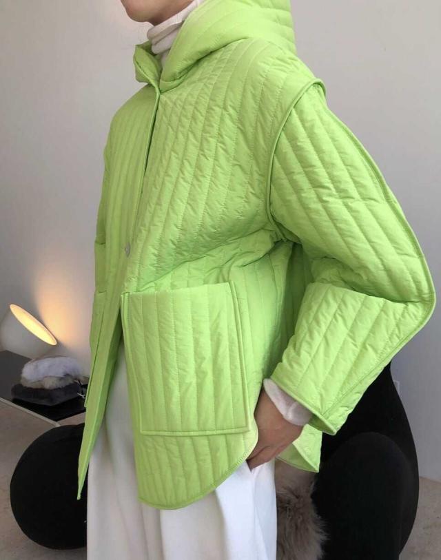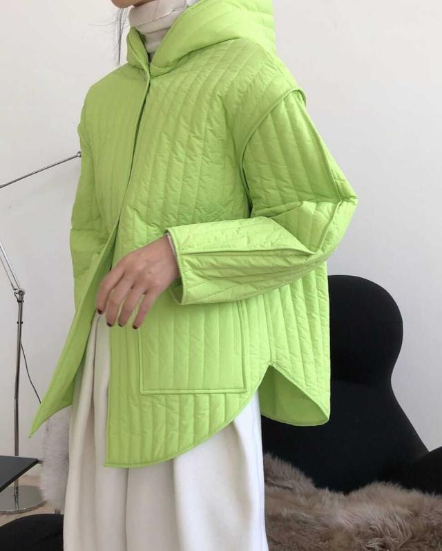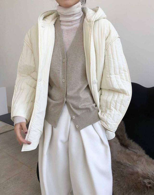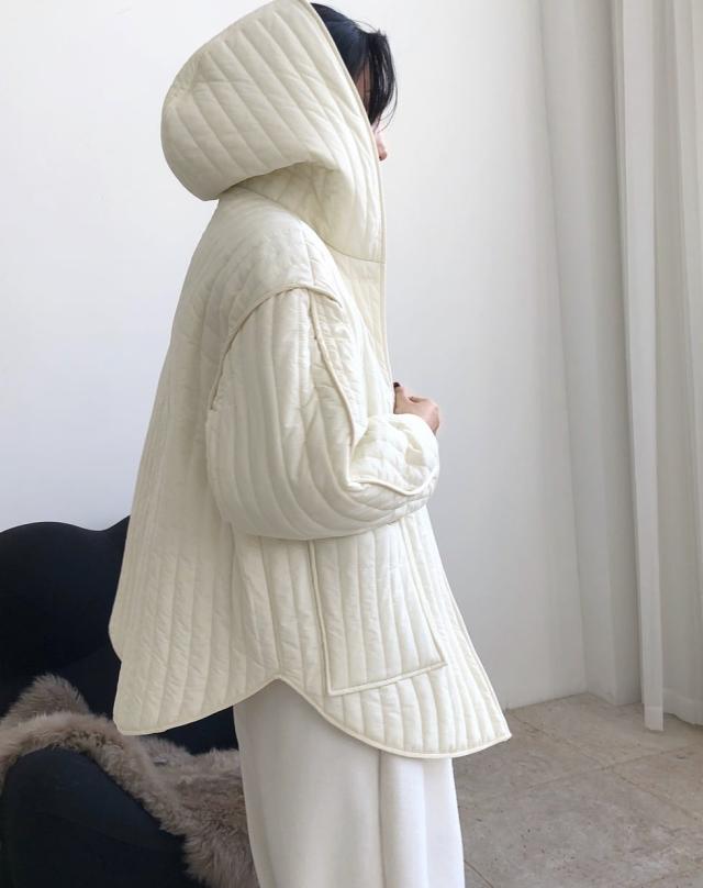 ストライプパターンと繊細な切り替えがこなれた中綿コートです。