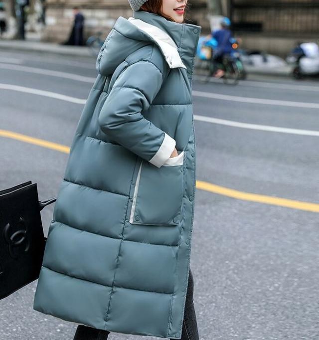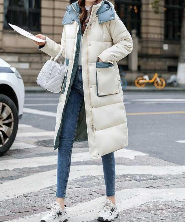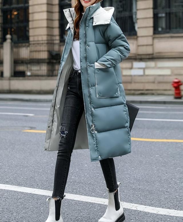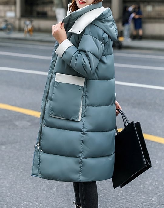 バイカラー配色が可愛いフード付き中綿ミディアム丈コートです。