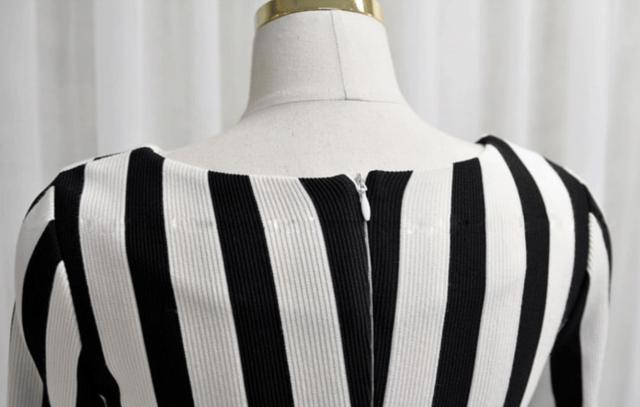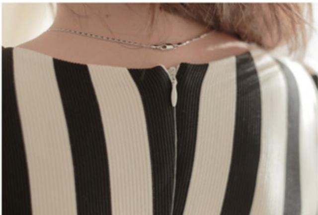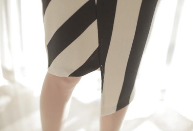 ストライ柄で痩せ見え効果もありフェミニンなラインの一枚。