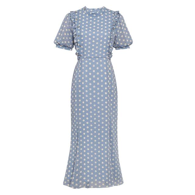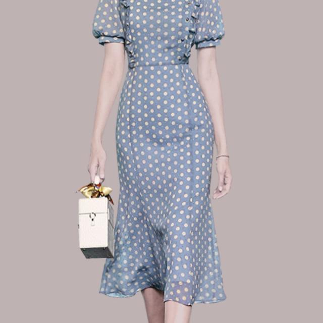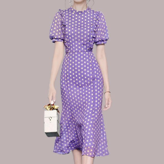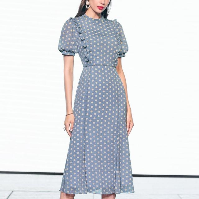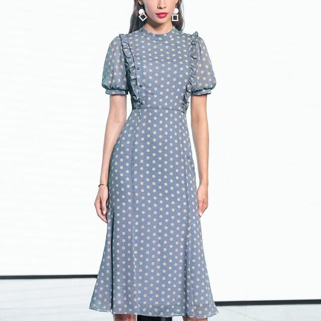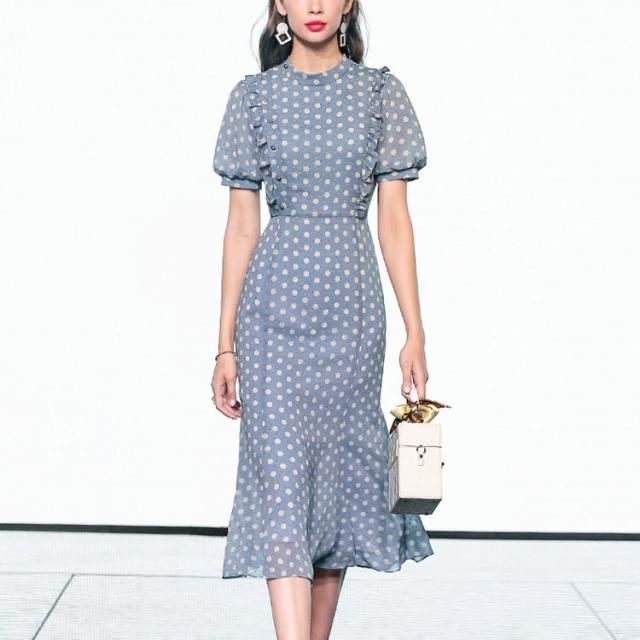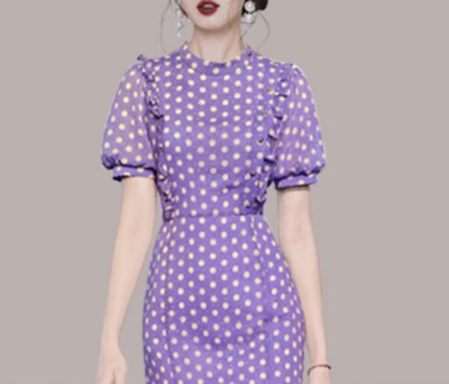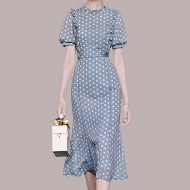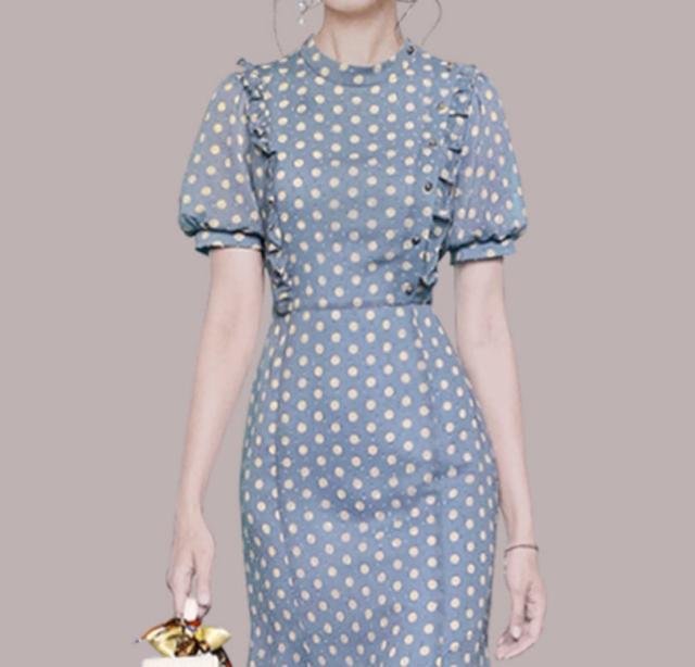 ワンピース 上着 人気 おすすめ おしゃれ お洒落 激安 安い 送料無料 プチプラ 半袖 ラウンドネック 丸首 柄 タイト パフスリーブ シフォン 膝丈 フリル プリント ドット 可愛い かわいい