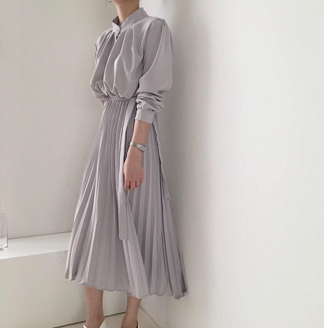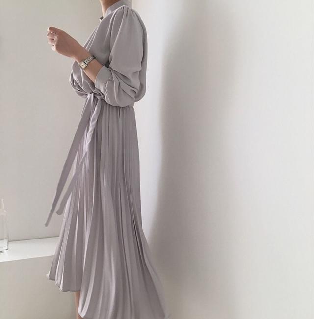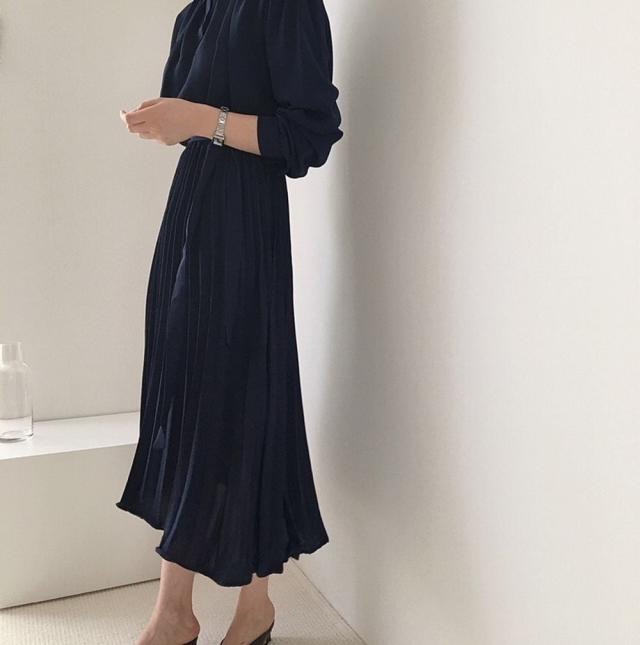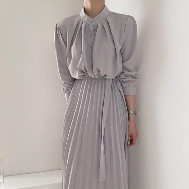 とろみのある生地のブラウストップスとプリーツスカートがお洒落な一枚。