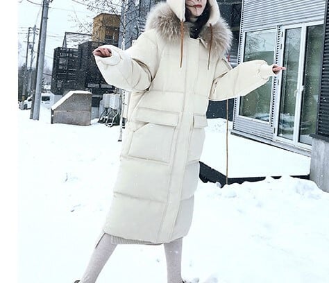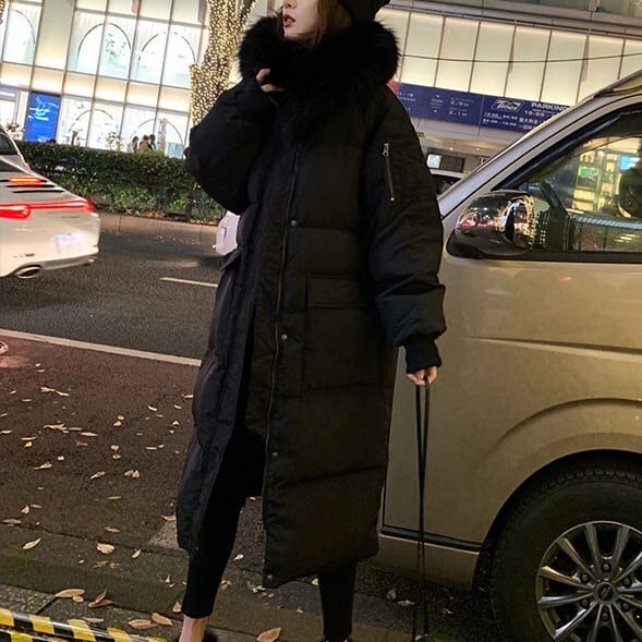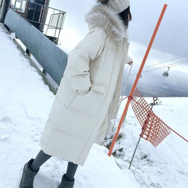 モコモコファーのビッグフードが可愛い中綿ロングコート。