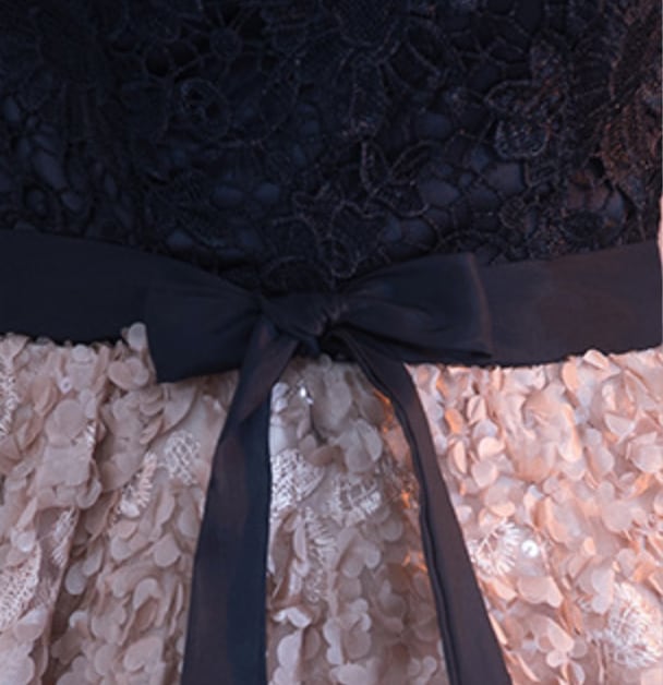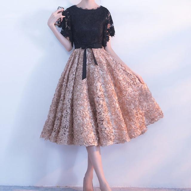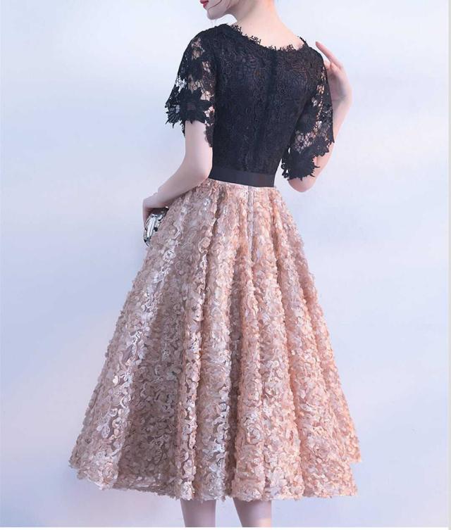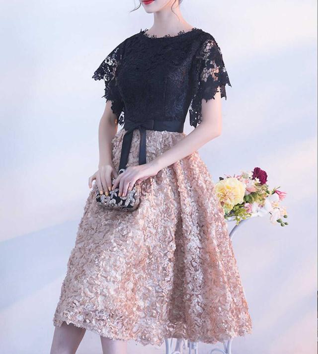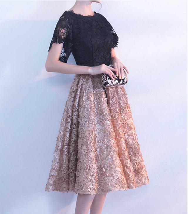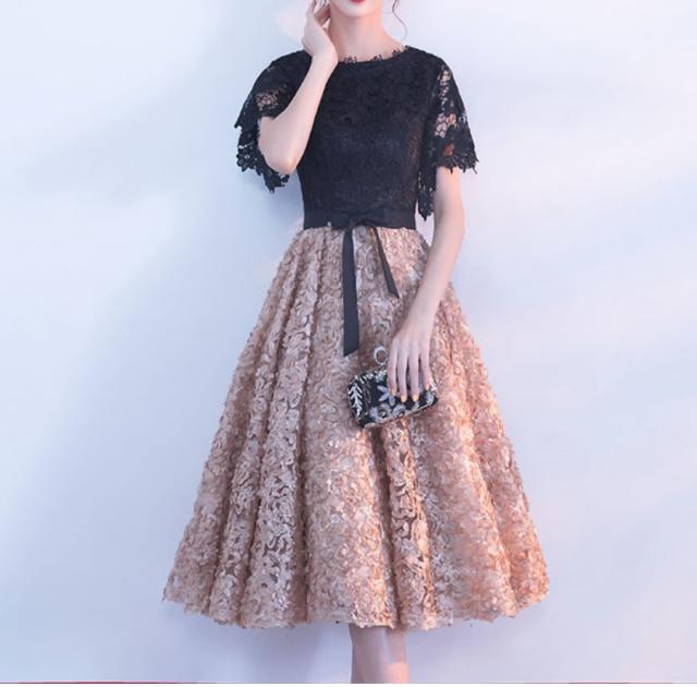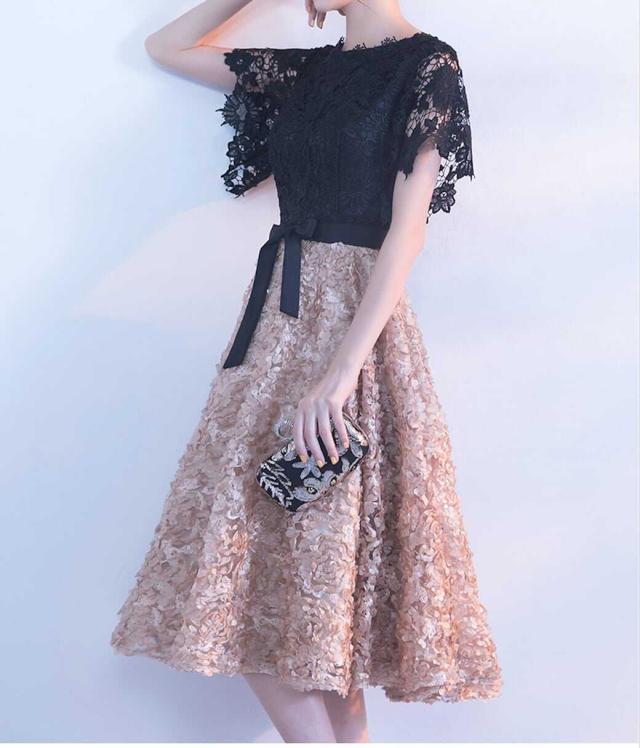 フローラルなボリュームスカートとレーストップスの可愛いパーティードレス。