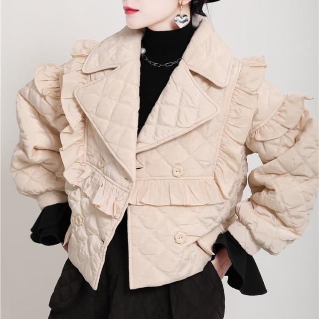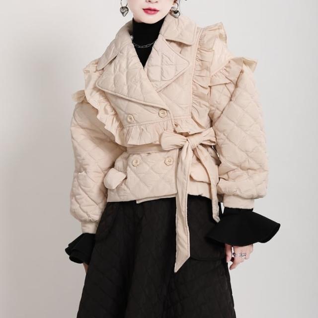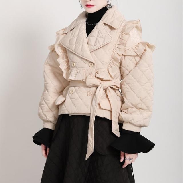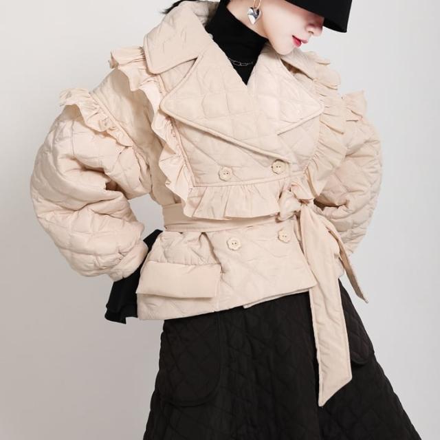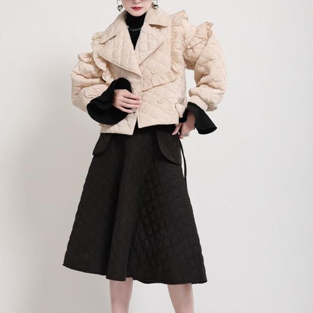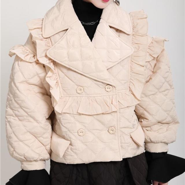 中綿コート レディース アウター キルティングジャケット ショート丈 フリル モード 切り替え 襟付き キルティング 薄手 マニッシュ 韓国風 軽い 軽量 冬服 厚手 アウター 暖かい