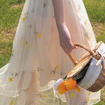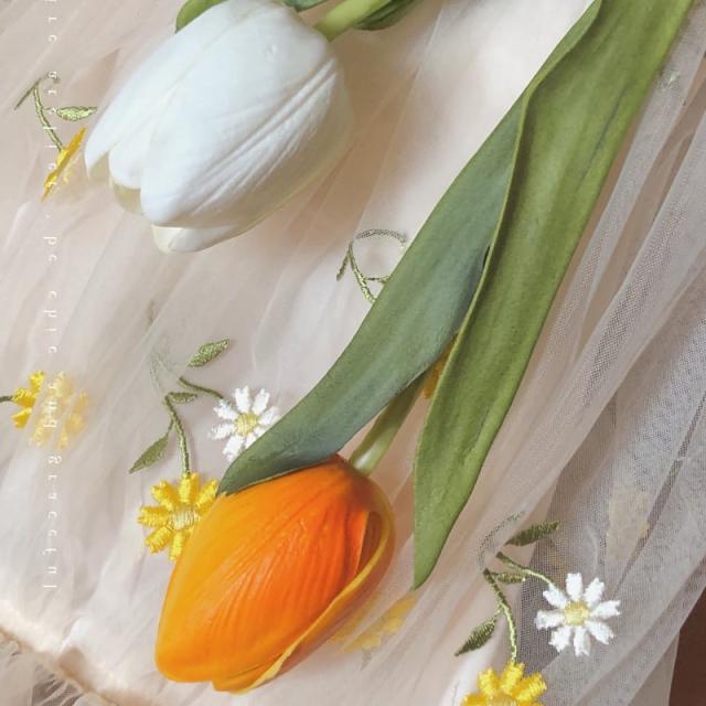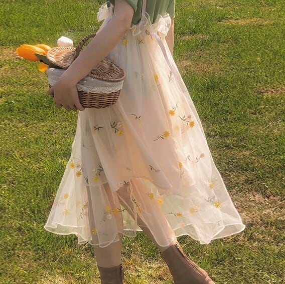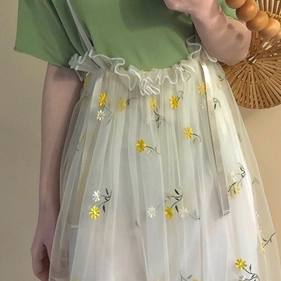 メッシュ生地に散りばめられた細かな花柄の刺繍がレトロな雰囲気でおしゃれ。