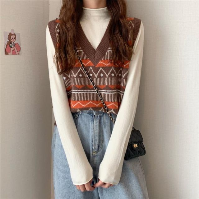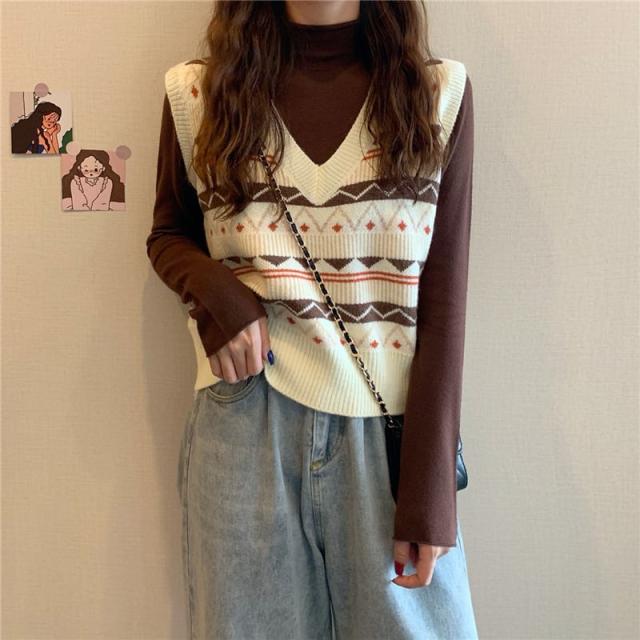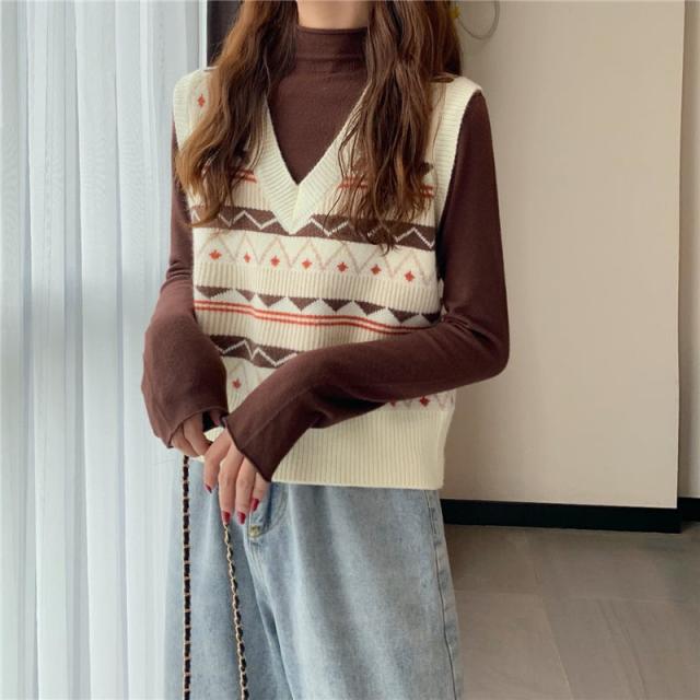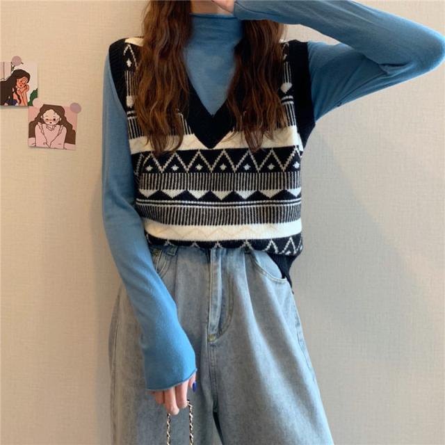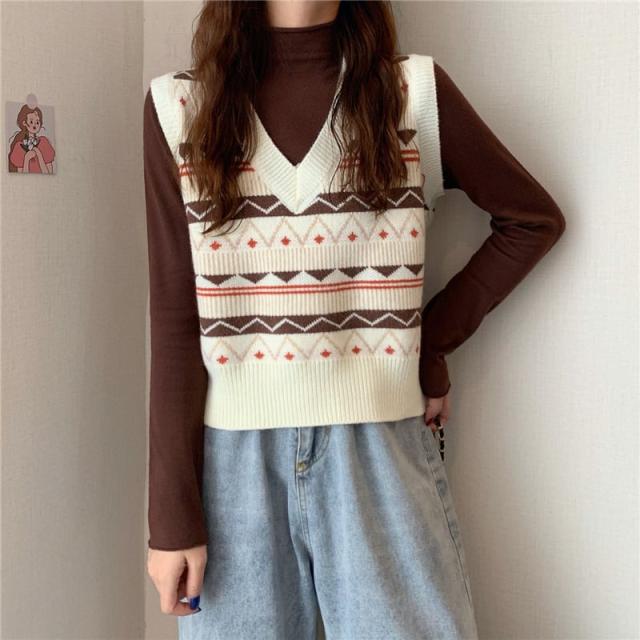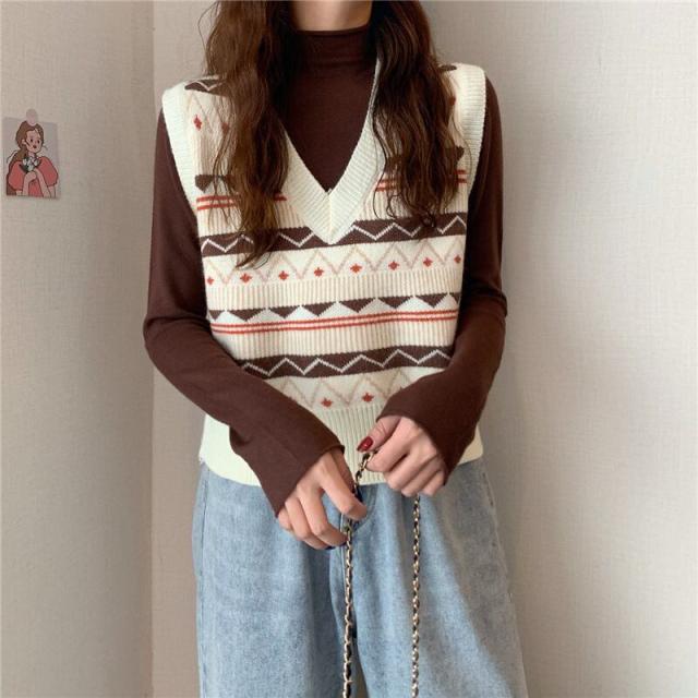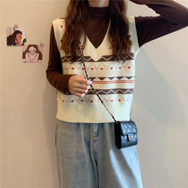 レディース ノースリーブ ベスト Vネック ニット プルオーバー 幾何学模様 韓国 新作 体型カバー トレンド 可愛い かわいい かっこいい カジュアル 大人 上品 きれいめ シンプル クラシック