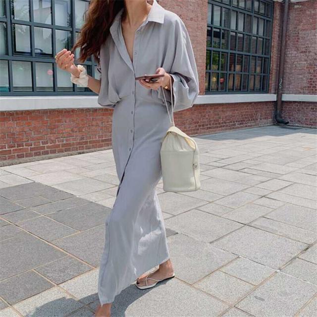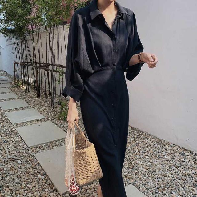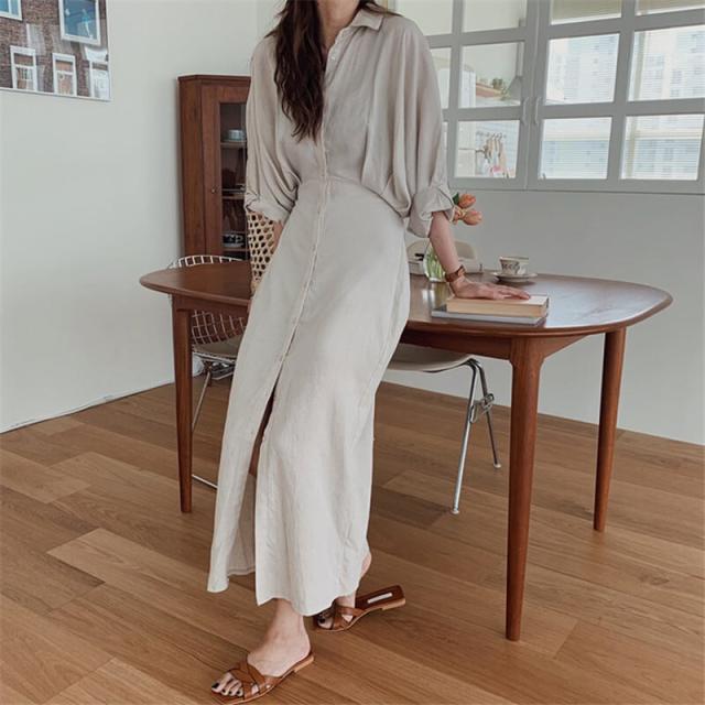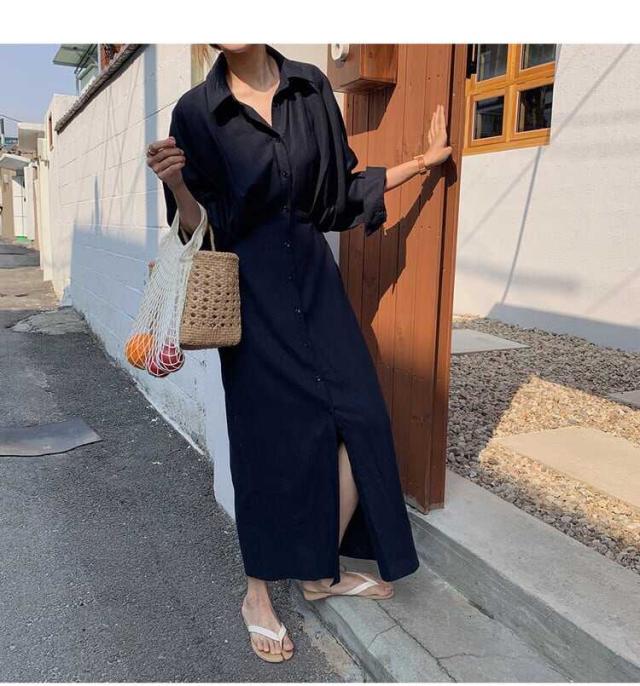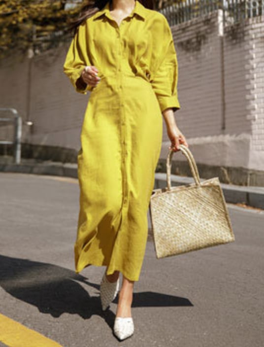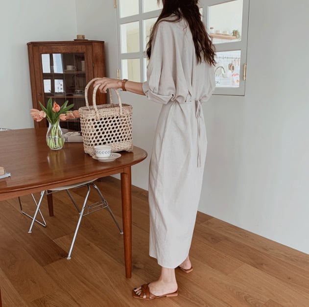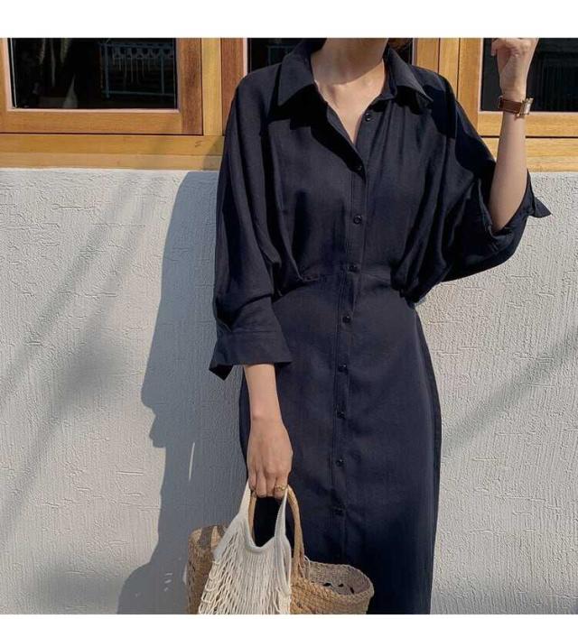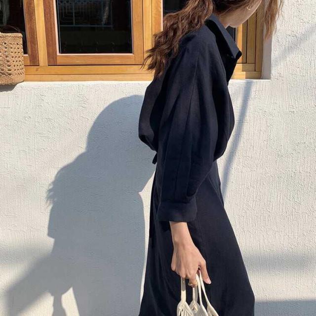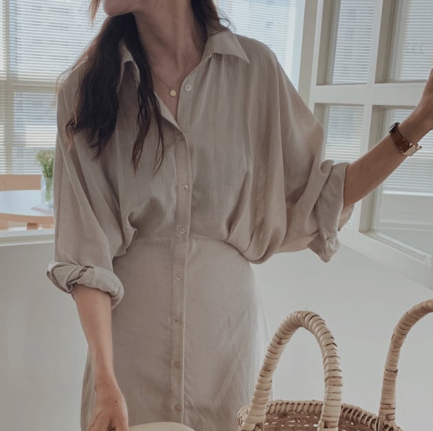 ゆったりとしたシルエットのロングシャツワンピース。