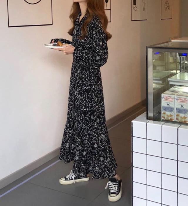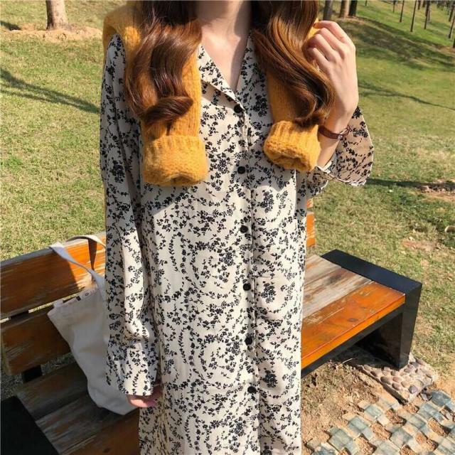レトロなフローラルプリントのロングシャツワンピース。