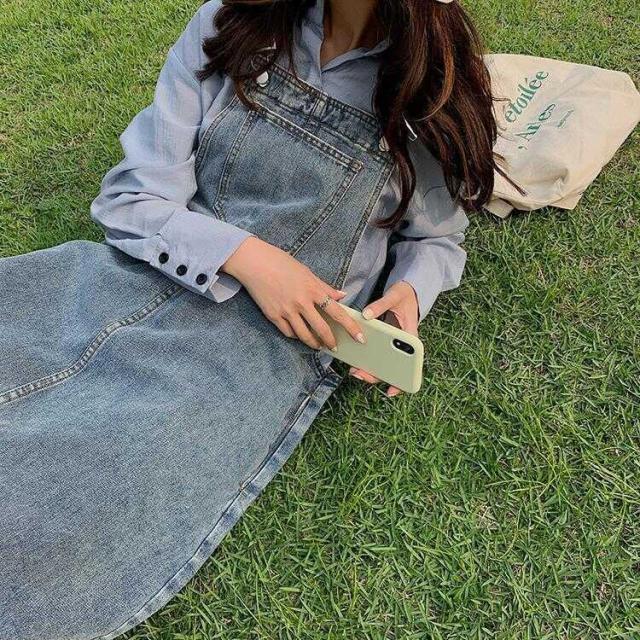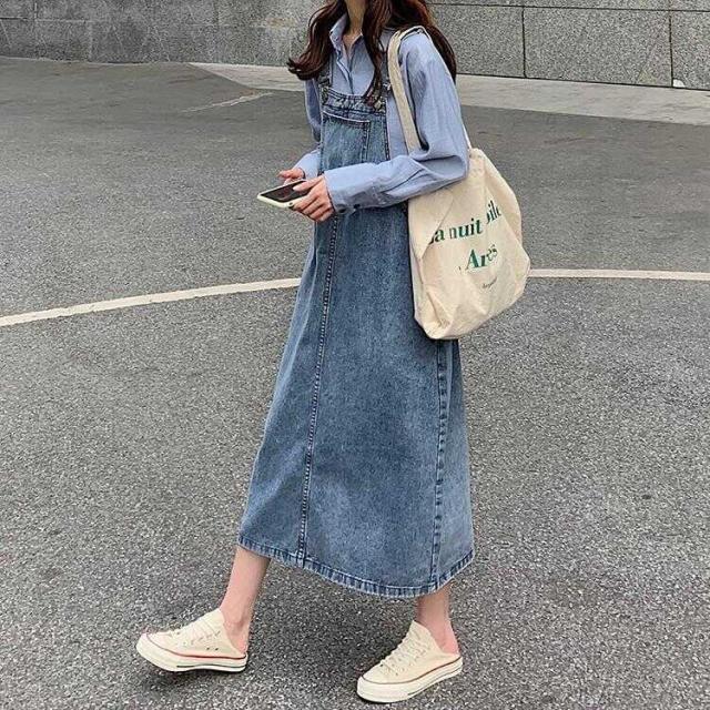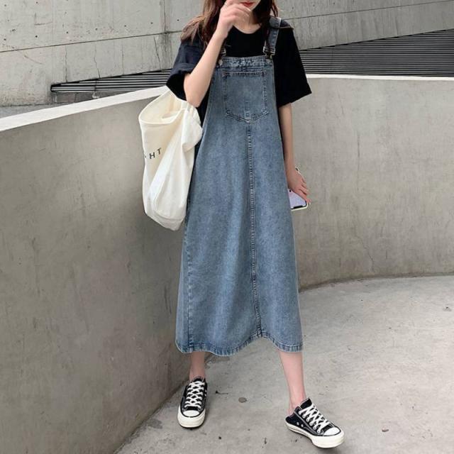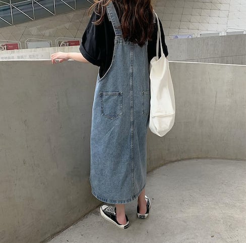 カジュアルなデニムのロングサロペットスカート。