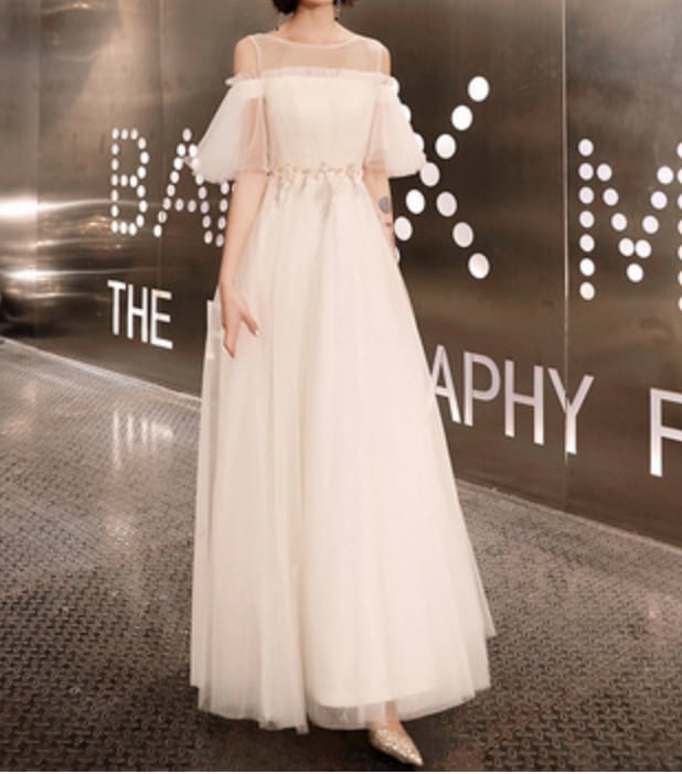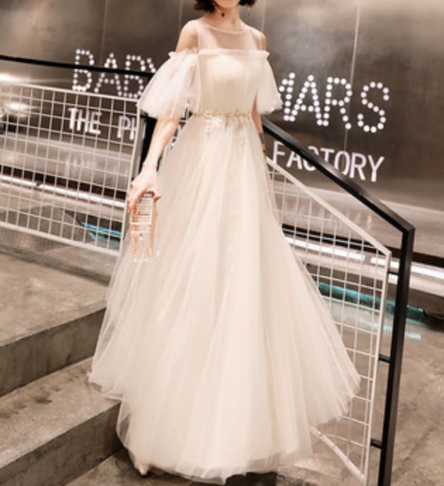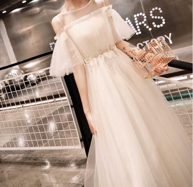 ふんわりチュールのスカートが可愛いロングパーティードレス。
