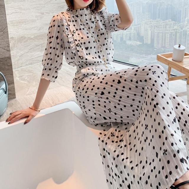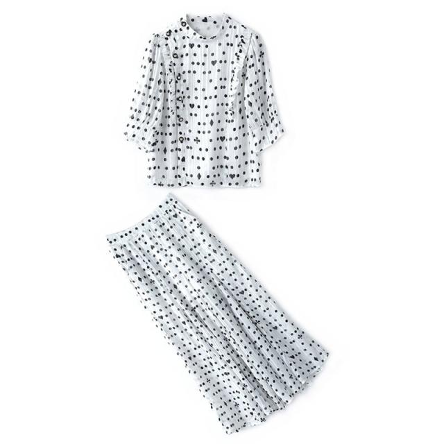 ドット柄のブラウスとワイドパンツのセットアップ。