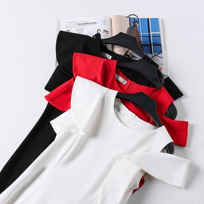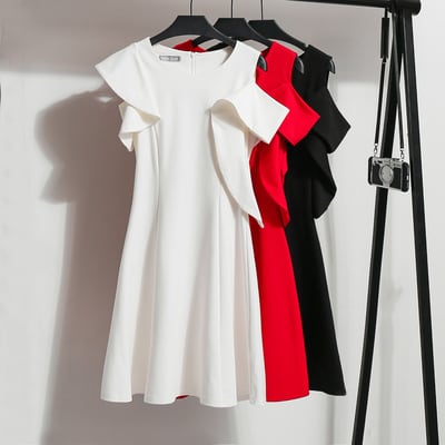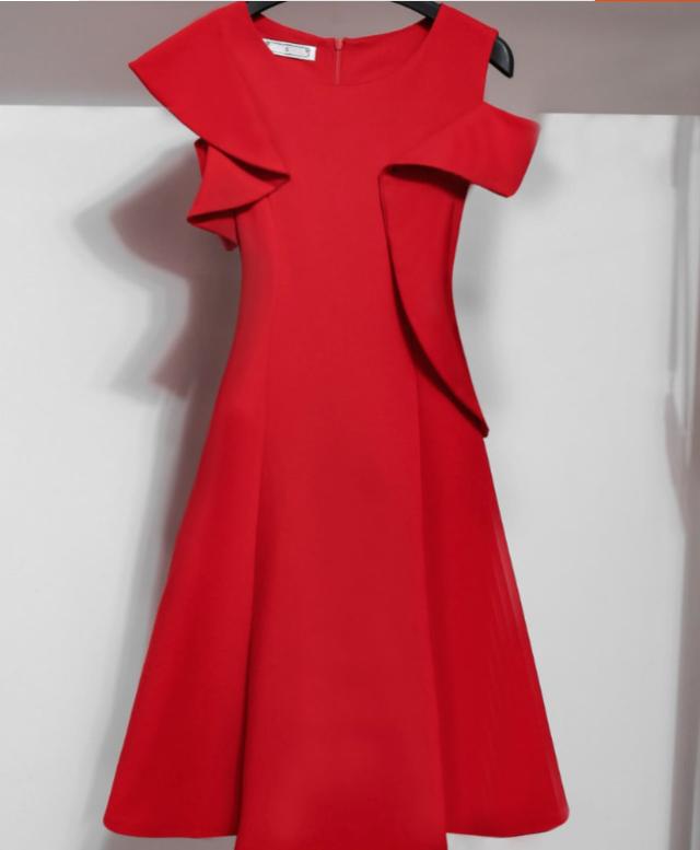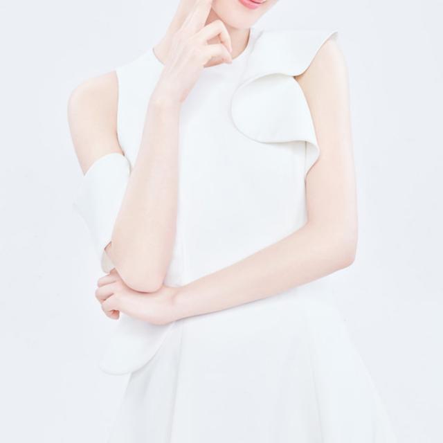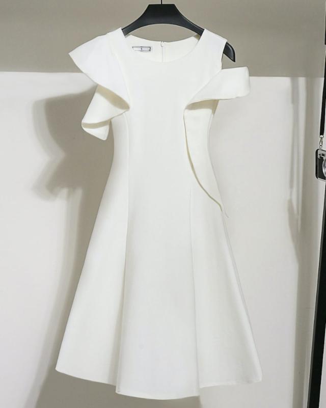 袖のフリルとフレアなスカートでフォーマルなシーンにぴったりな一枚。