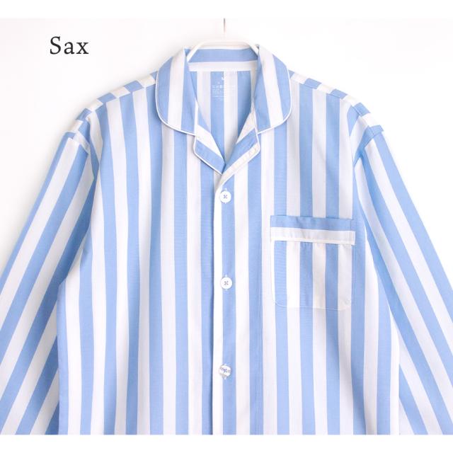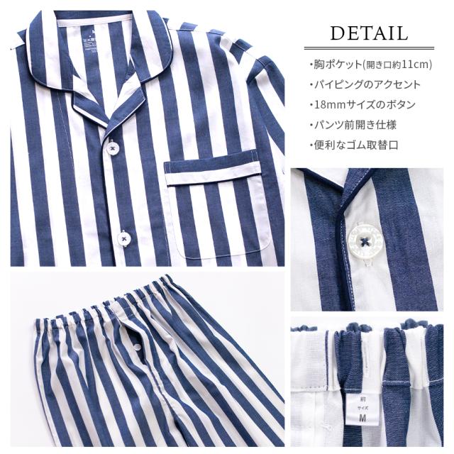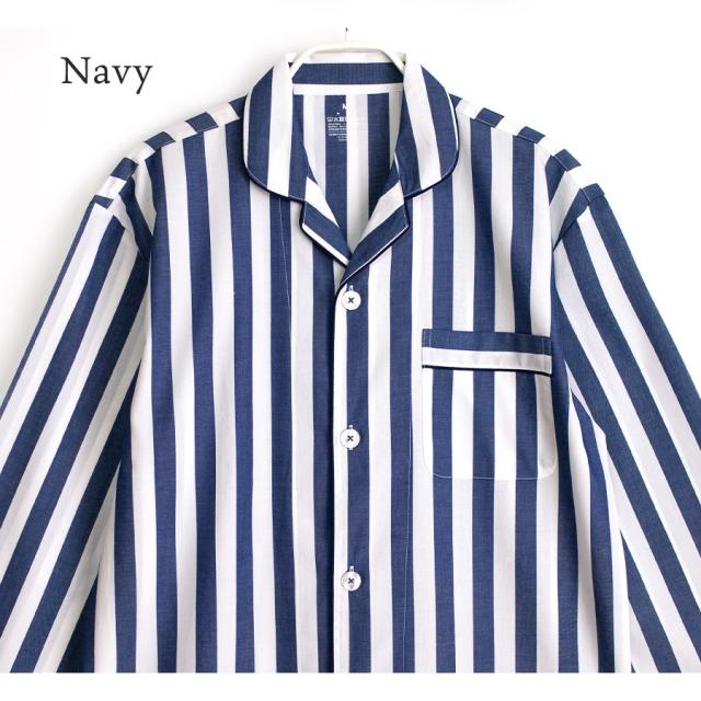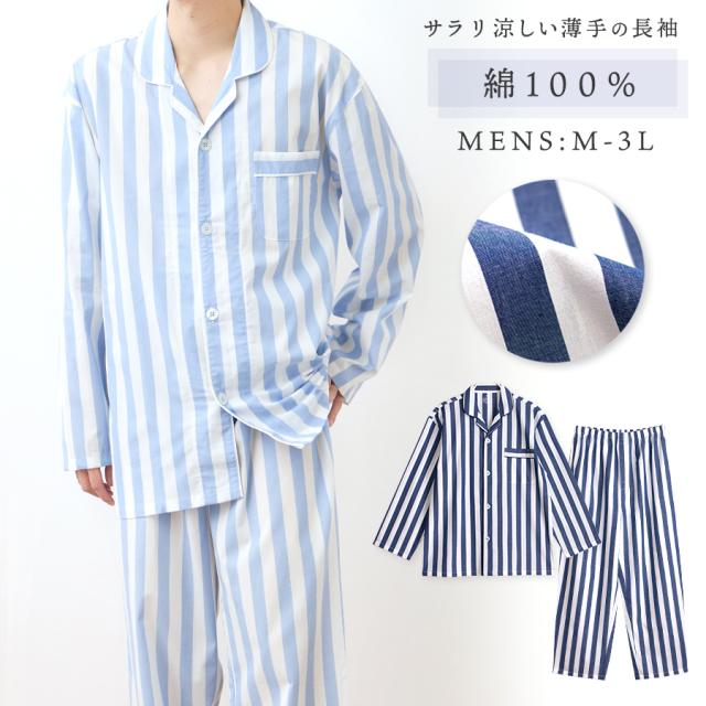 パジャマ メンズ 綿100% 長袖 春 夏 前開き ボタン シャツ ストライプ ネイビー ミント サックス M L LL 3L 先染め おそろい