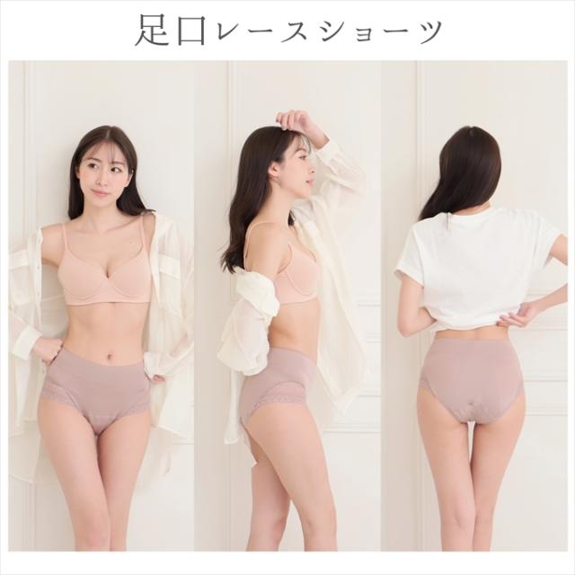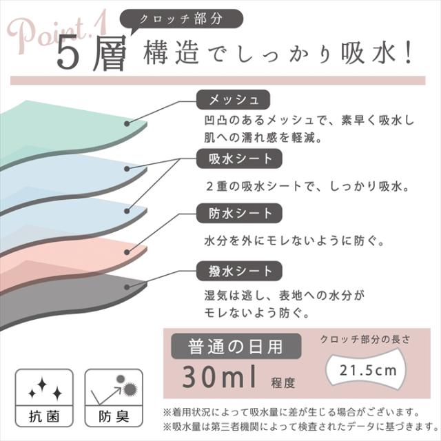 こだわりの5層構造でプラス防水布付き。特殊なメッシュ構造ですばやく吸水。羽つきナプキン対応で浮きクロッチだから外側へ出ずスッキリ収まります。