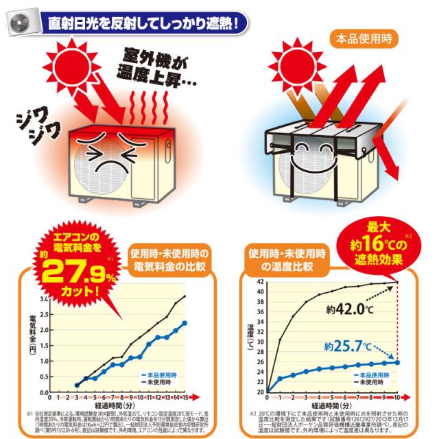 ひさし付きのエアコン室外機用の遮熱パネル!直射日光を反射して、しっかり遮熱!ひさしが付いた、エアコン室外機用遮熱パネル!上からだけでなく、前・サイドからの直射日光もしっかりガード!直射日光の遮熱だけでなく、ホコリや汚れ対策にも