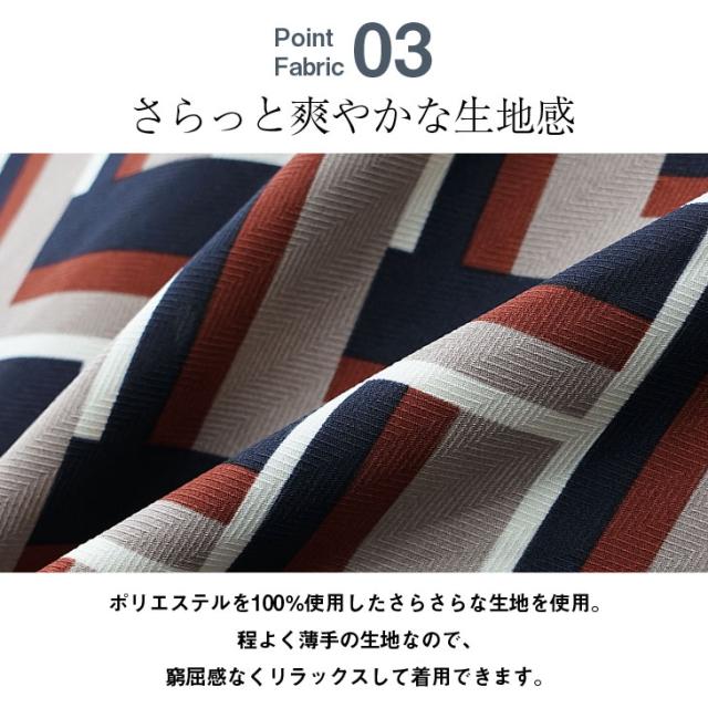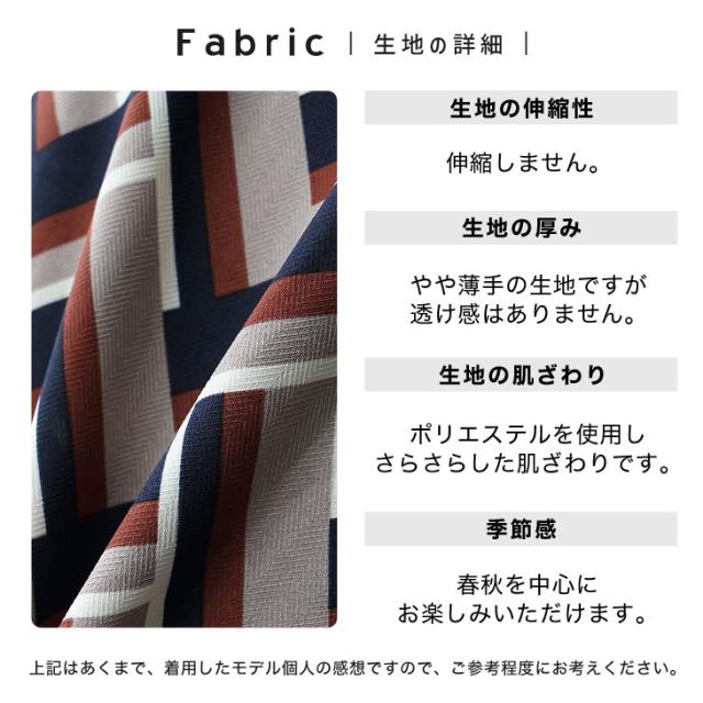 幾何学柄のデザインと鮮やかな緑や赤、ネイビーといった色が春っぽさにピッタリの一着。襟があまり高くないデザインなので首元がスッキリとした印象に。着るだけでサマになる華やかな一枚です。