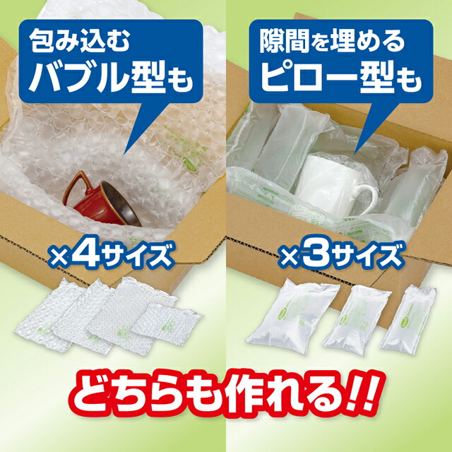 モノを包み込むバブル型、隙間を埋めるピロー型どちらも製造可能のスグレモノです。