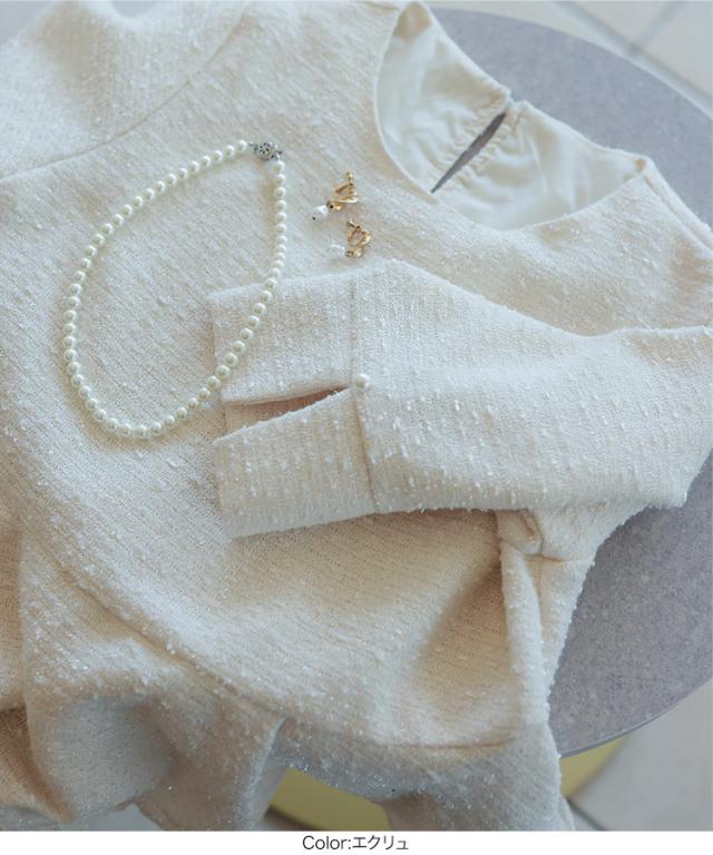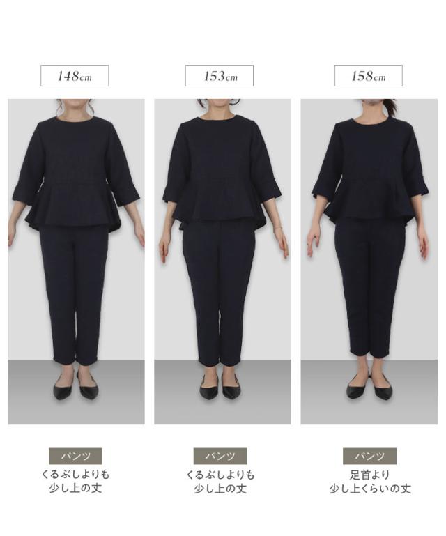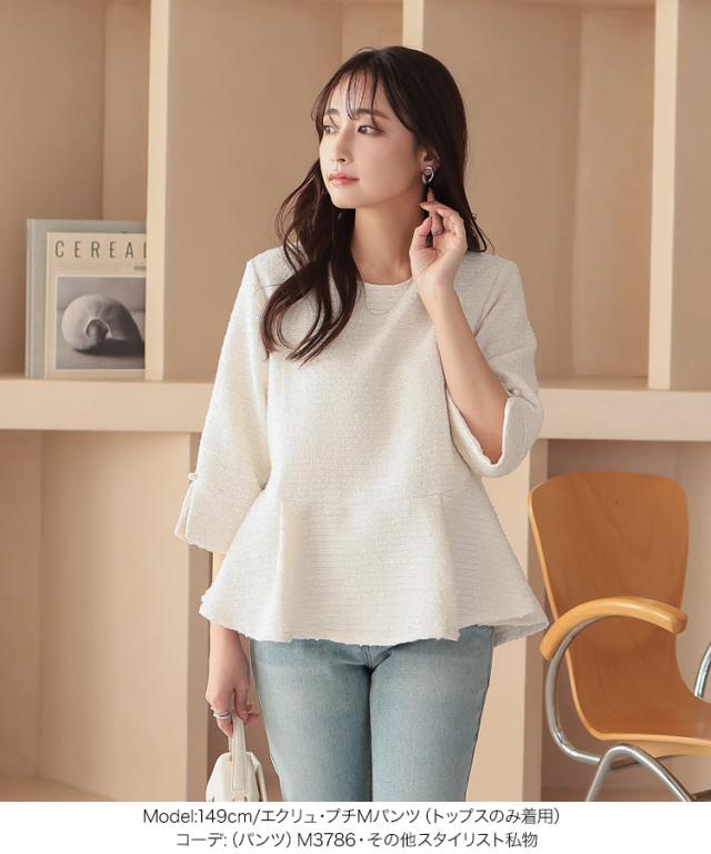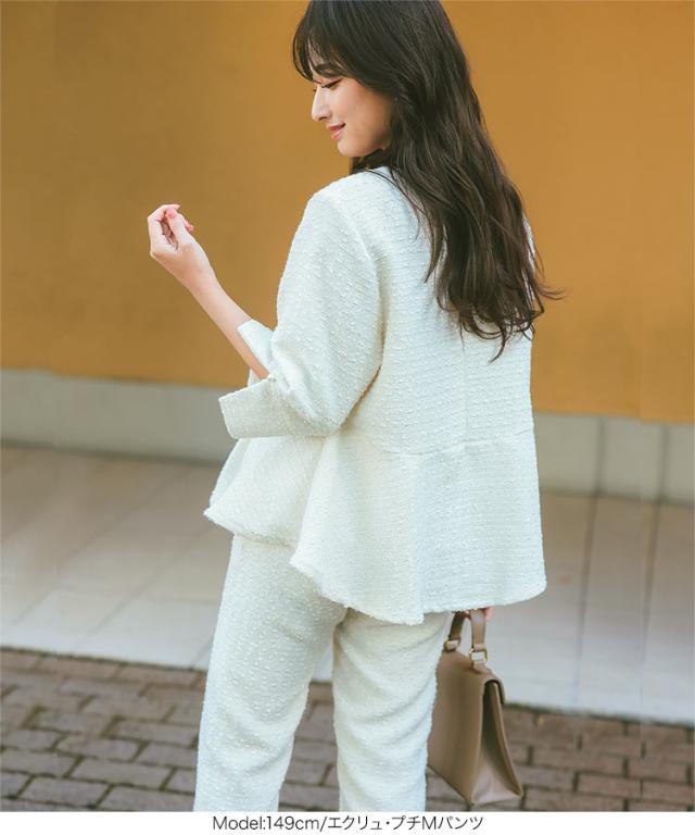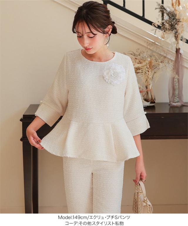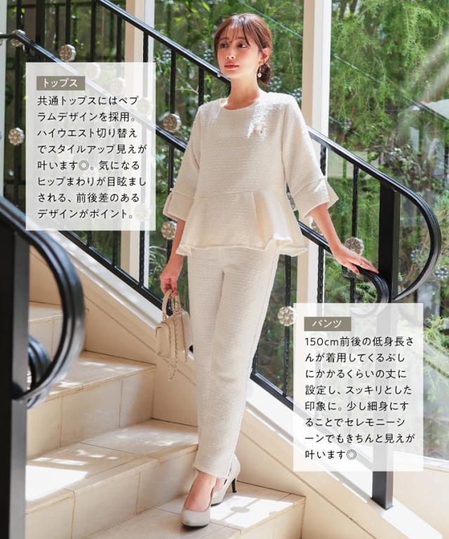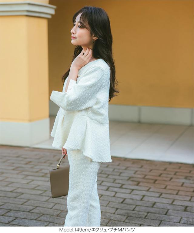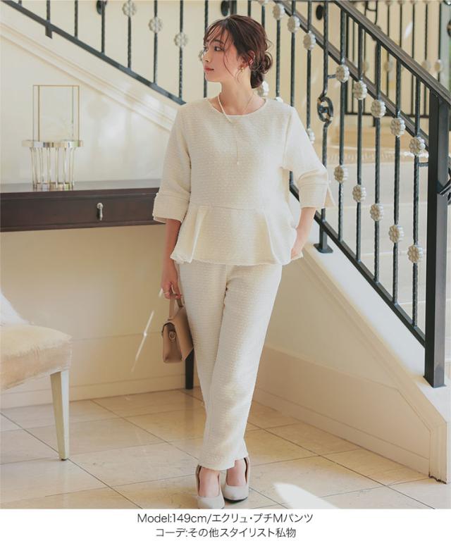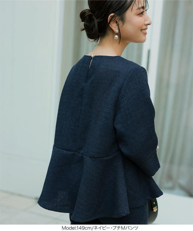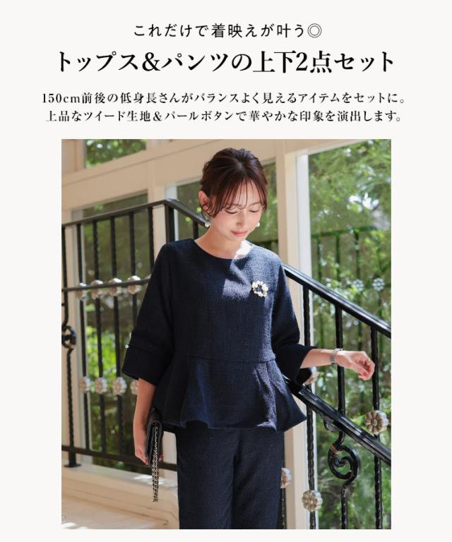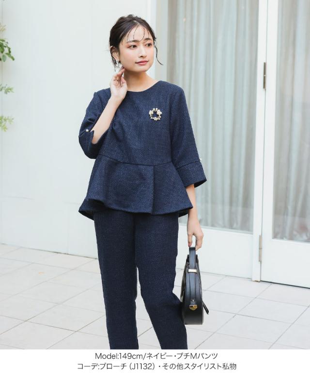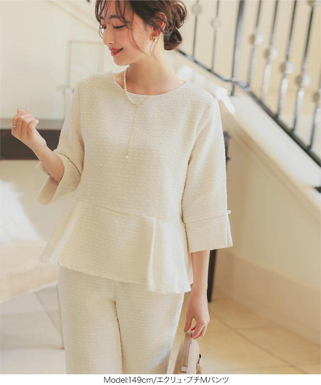 ペプラム切り替えがポイントのトップスとパンツのフォーマルセットです。高級感がある女性らしいツイードを使用し、長くマルチに着用していただけるデザインに仕上げました。パールボタンが大人っぽさと品の高さを演出します。学校行事やフォーマルなシーン、デイリー使いにもピッタリです。【素材・サイズ感】低身長の方にも合わせやすい丈感、サイズ感にこだわりました。ソフトな風合いのツイードに裏地付きの仕様で肌あたりも滑らかです。スリット入りの袖口で気分やシーンに合わせてロールアップしていただけます。ウエストはバックゴム仕様でストレスフリーな履き心地です。※キャンセル/変更不可※お届けまでの日程について