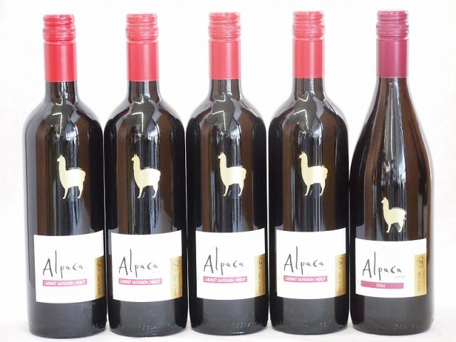 チリ産ワインアルパカ5本セット(赤シラー(フルボディ) 赤カベルネ・メルロー(ミディアムボディ)) 750ml×5本