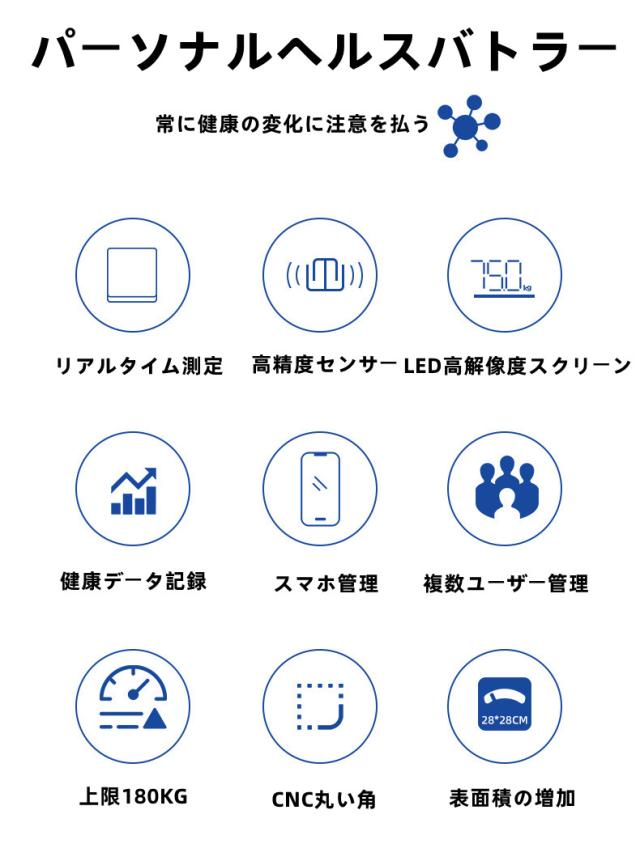 スマートで薄型体重計、収納便利!シンプルで智能感知、乗る降りるで自動電源ON/OFF設計!いつでも簡単使えます(乾電池付だけ)複雑な機能をあえて排したシンプルな体重計です。※※※注意:Bluetoothでアプリ連携仕様ではありません!※※※複数ユーザー使えます。健康データ記録体重計です。APPでいつでも自分の健康を確認できます安心設計。厚さ2cmの超薄型でスキマにさっと収納可能。デジタル表示で数値が見えやすい。
