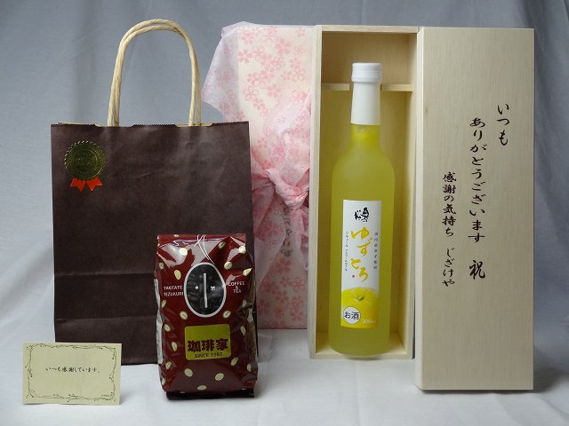 贈り物セット リキュールセット いつもありがとうございます感謝の気持ち木箱セット(とろり果汁・果肉とお米のうまみが見事にコラボした ゆずとろ500ml+オススメ珈琲豆(特注ブレンド200g)) メッセージカード付き